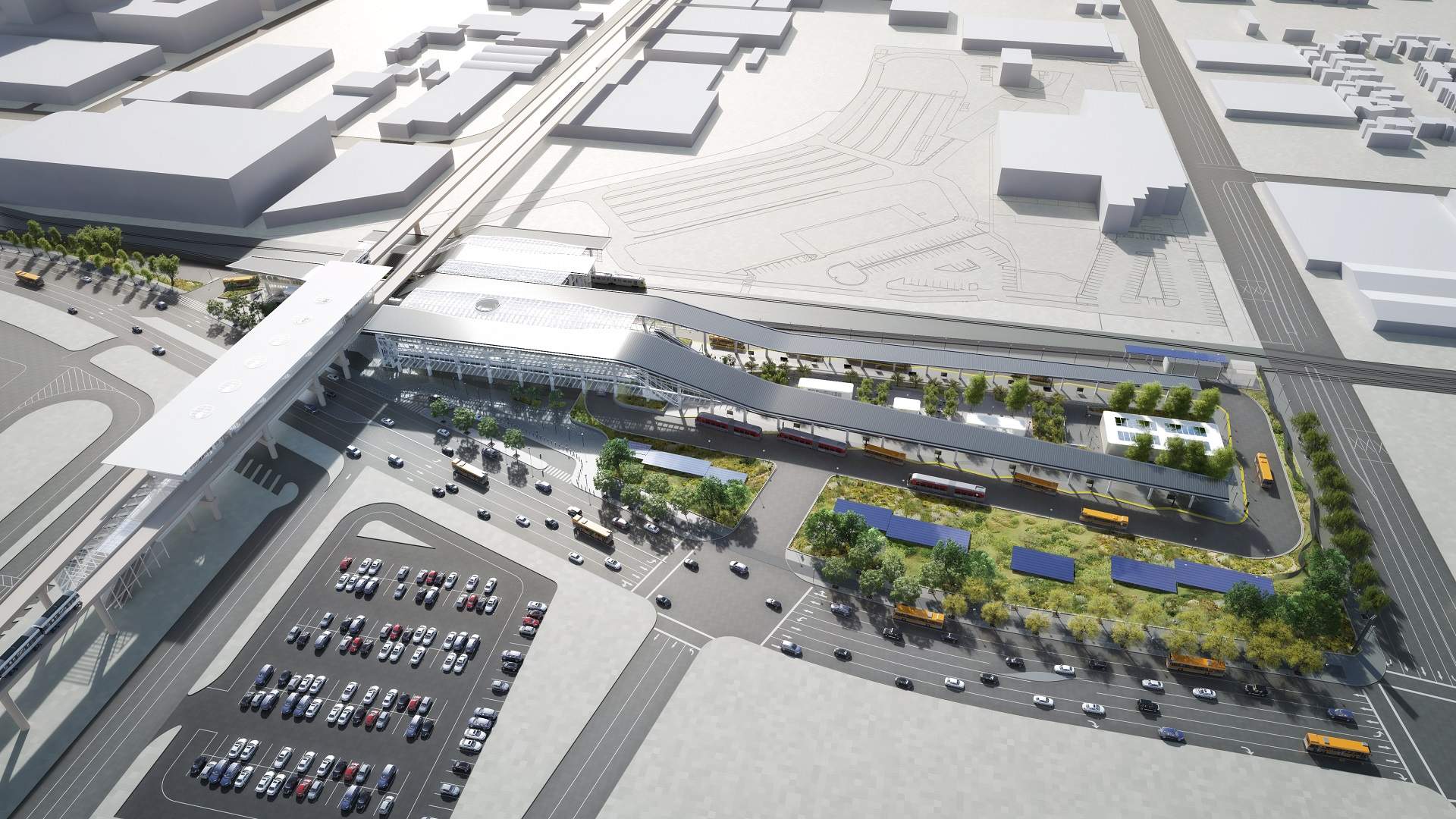 The Airport Metro Connector (AMC), which will rise from a roughly 9.5-acre site at the intersection of Aviation Boulevard and 96th Streets, will allow passengers from the Crenshaw/LAX and Green (C) Lines to access the new LAX automated people mover system. The projects will include: a 16-bay bus plaza with capacity for charging infrastructure; a multi-level active transportation and bike hub; a vehicle drop-off zone; a customer service center; public toilet facilities beyond the fare paid zone; commercial space; and a sculpture by Los Angeles artist Glenn Kaino, which will be incorporated into the station’s hub structure.
