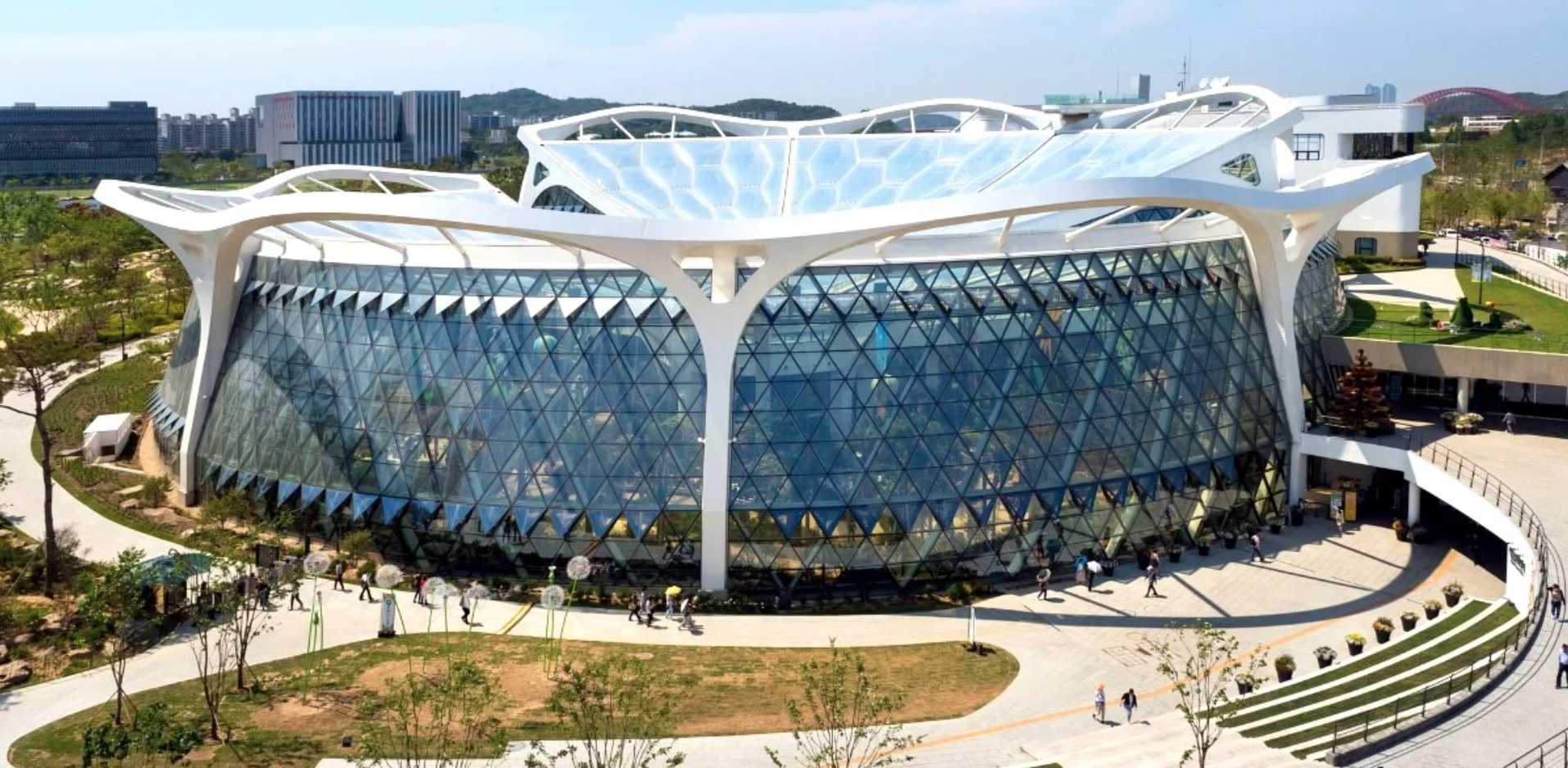 Seoul Botanic Park was built in Magok, on the southwestern side of the Han River in Seoul, to create an urban public space that can introduce flora and cultures of 12 global cities and enhance ecological sensitivity. While most greenhouses come with a geodesic dome-shaped design, the Seoul Botanic Park flips this notion with its uniquely recognizable 100m wide concave roof. The rim of the greenhouse is higher than its center, giving it the resemblance of a flower – a feature that’s further highlighted by the petal-shaped pillars around the outer edge of the park.