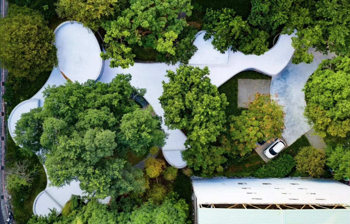 At this sales center, visitors can quietly experience the environment with their own senses instead of through text or speech. The amoeba-shaped building weaves through trees, coexisting with the flora without influencing or disturbing it. In order to achieve this, the designers thought of breaking the singular building mass into smaller scattered building units. These units are arranged randomly like satellites around the original trees, connected by the winding cloister and encircling the old tree at the center of the site.