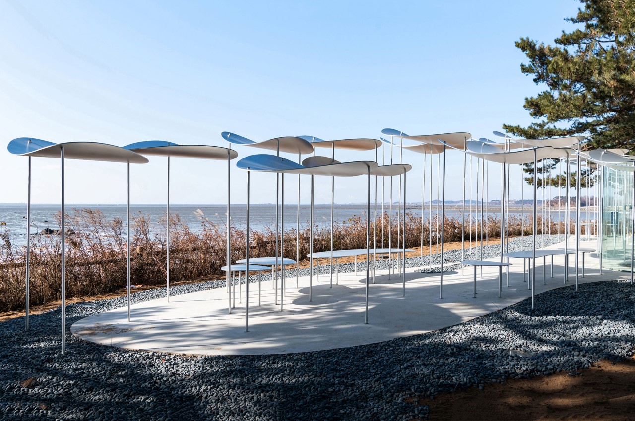 The OSOL Pavilion is a symbol of renewed beginnings and of friendship, as it stands at a place that was once littered with military fences. Built on the west coast of South Korea, the permanent exhibit marks the relaxing of military tension between North and South Korea, and sits among a forest of pine-trees facing the tranquil Yellow Sea. Inspired by the reflection of light on the sea, OSOL, the pine forest-like structure made from anodized aluminum, reflects the surrounding colors and allows visitors to gain a new perspective on the relationship between man and nature, encouraging them to develop a deeper appreciation of nature.