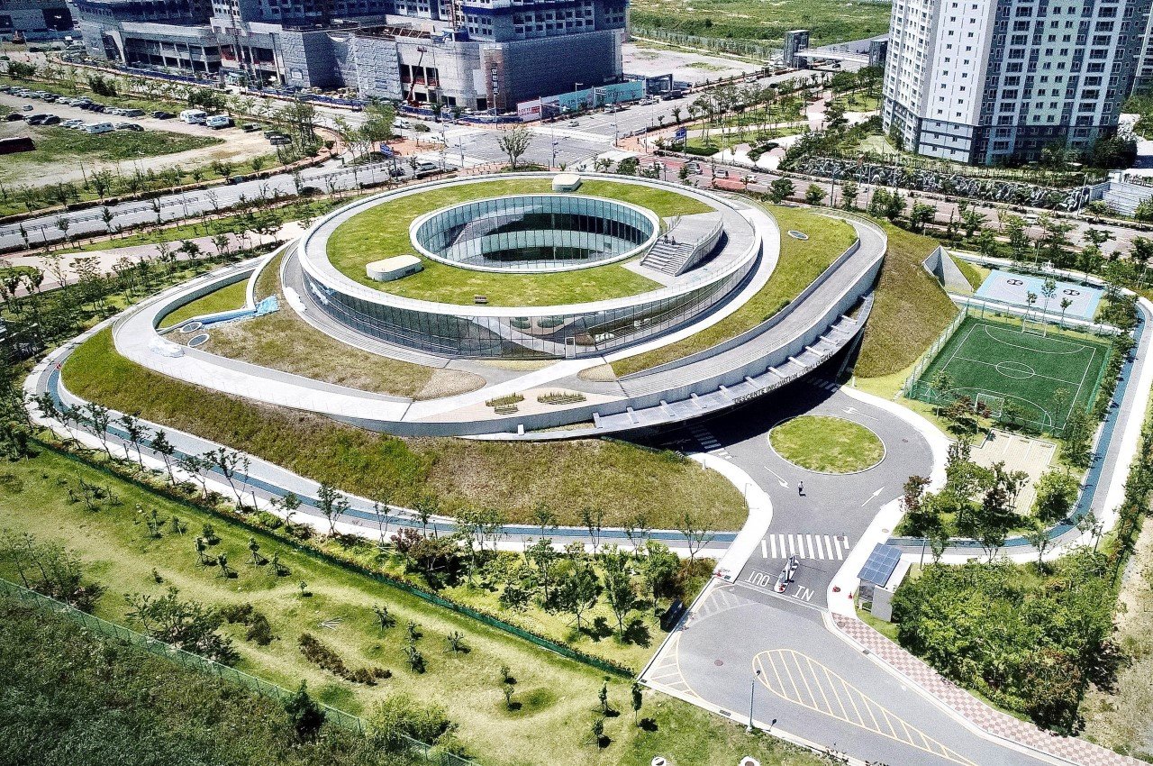Designed to be a sports R&D lab, the circular shape of the building is a reference to the circular tracks that runners dash around. It’s also characterized by an artificial hill in the form of a spiraling lawn that surrounds the building, creating a rather unusual blend of greenery and architecture. “Through this winding artificial hill, DISC achieves harmony with the urban context while maintaining an eco-friendly design”, mention the designers. The building’s design draws the viewers’ eyes to its center, which exists almost like a crater. Within this center is the building’s courtyard, its green heart, an open space for creative communication.