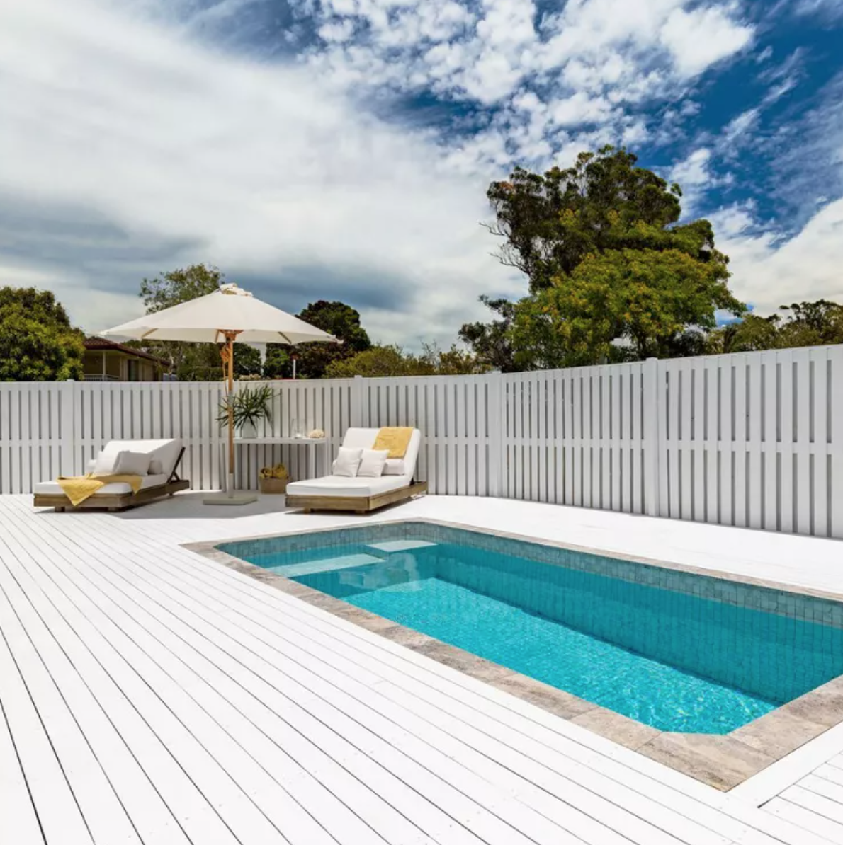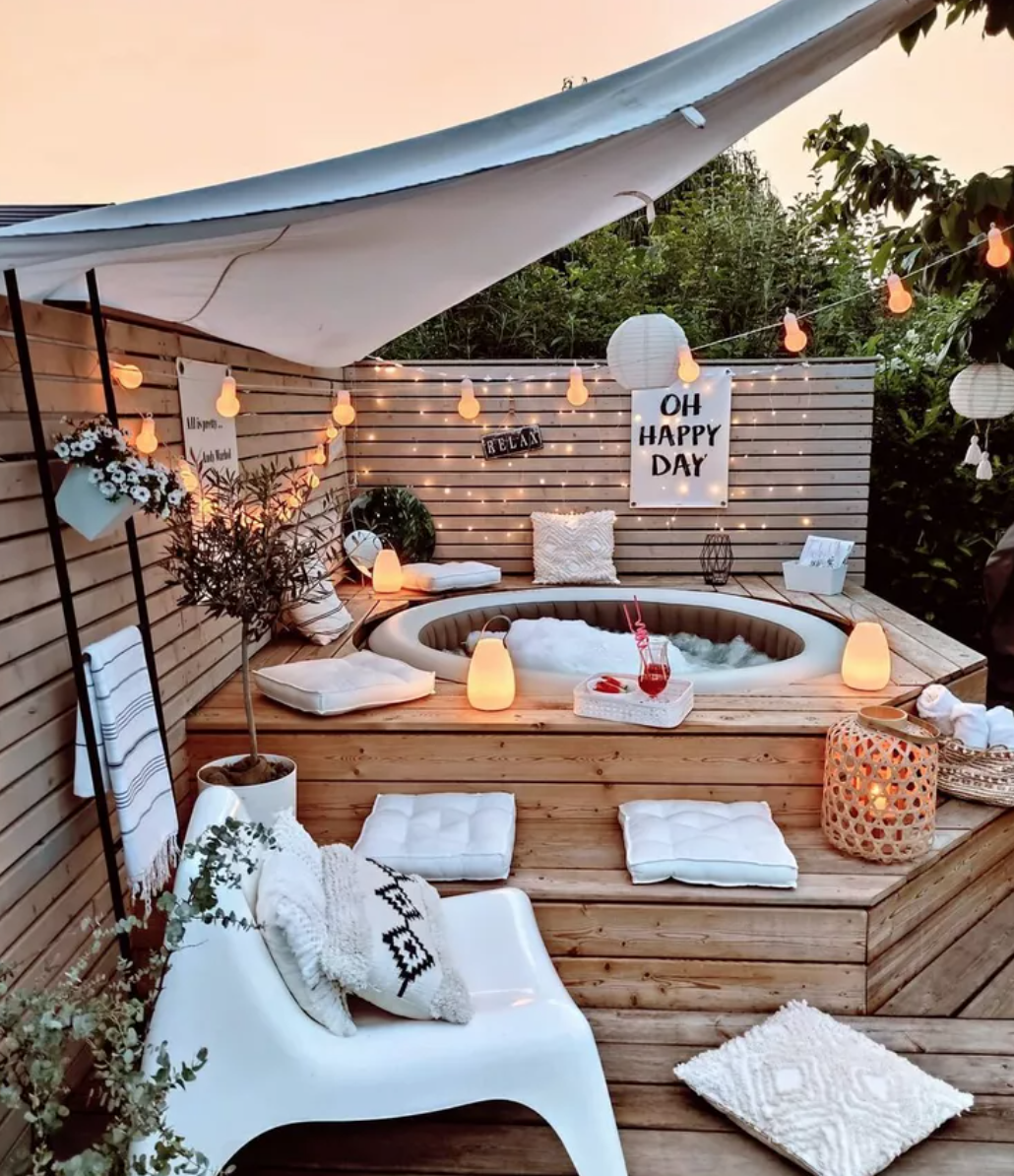 This above-ground pool features wood decking and a built-in privacy fence that works double duty as a place to lean back and rest while dipping your feet in the pool. An inflatable pool like this one can start around $200.