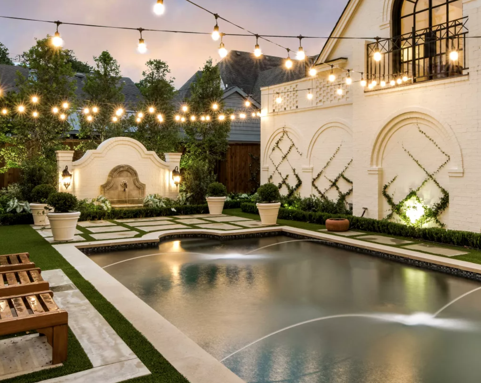 Your pool acts as a natural mirror, something that you can use to your advantage in pool lighting ideas. ‘When designing the pool and the yard, ultimately to be enjoyed at night, be sure that there are elements worthy of being lit and reflected in the pool,’ explain Kirk Bianchi and Janet Lenox Moyer. This can include the illuminated outline of a nearby pergola, lanterns that line the pool’s edge, or cascading, twinkling lights that hang overhead.