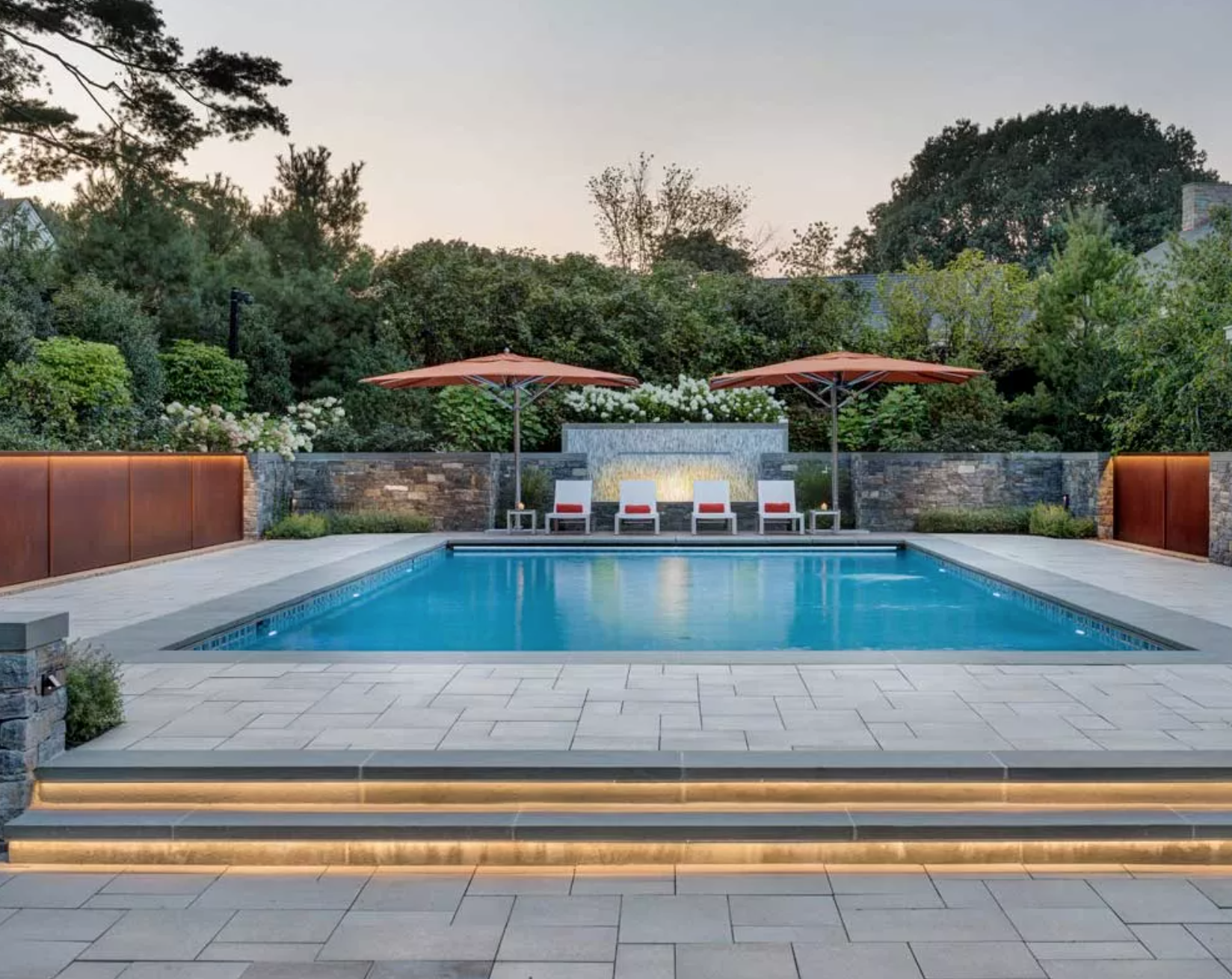 In addition to turning to pool lighting ideas for added safety in your outdoor space, by illuminating pathways and walking areas, you need to think about the safety of the lights themselves. ‘First, you should ensure that any low voltage landscape lighting is located outside of the zone deemed safe by your local inspector,’ lighting designer Michael Deo emphasizes. Some inspectors use five feet away from the pool as a standard, while others enforce ‘the 10-foot rule. Check with your local jurisdiction,’ the lighting designer adds.