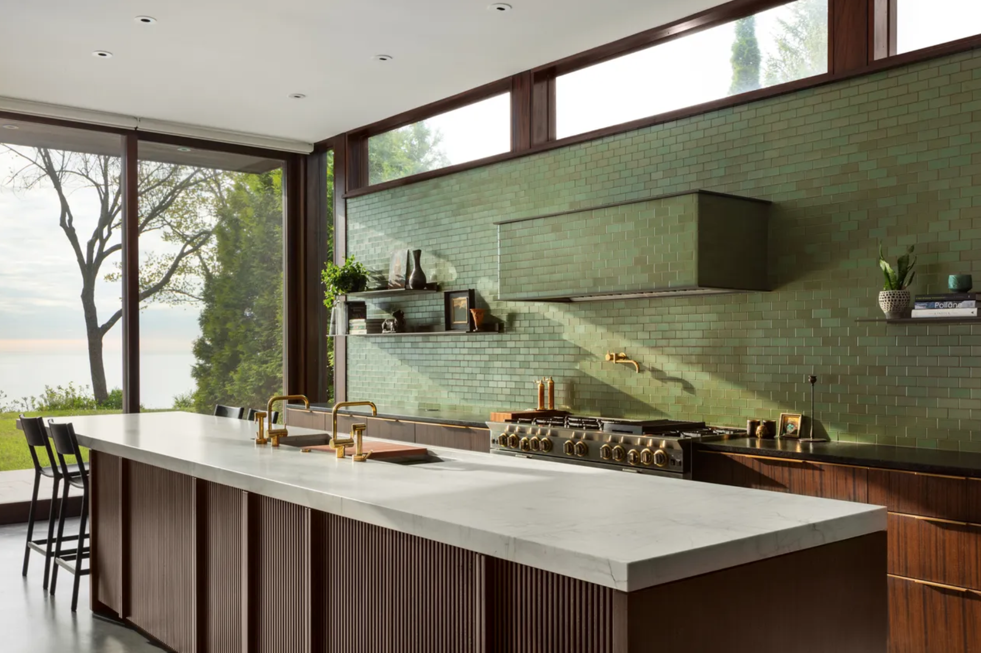 This green kitchen by Vetter Architects cleverly blends the range hood with the backsplash for an back wall that has a strong sense of continuity. The tiling style chosen for this kitchen is all about creating visual harmony, explains Jenni Vetter of Vetter Architects. “By extending the tiles across the entire wall, it introduces a warm, inviting texture that sets the mood of the space,” she says. Adding texture to the full wall elongates the room without overwhelming it too. “The tile forms a cohesive backdrop, allowing other design elements, such as the clerestory windows and custom metal shelving, to stand out while still maintaining a unified aesthetic,” adds Jenni. The olive green is another soothing element that keeps the space feeling warm and balanced. It complements the surrounding materials while offering a neutral yet rich backdrop. “The variation in color within this handmade tile reflects light in a way that makes the kitchen feel both inviting and sophisticated. It also creates a subtle contrast with the bold, deep mahogany cabinets and black natural stone countertop, without competing for attention,” she says. “Visually, it serves as a connector, tying together the color palette and materials to create a cohesive, polished look.”