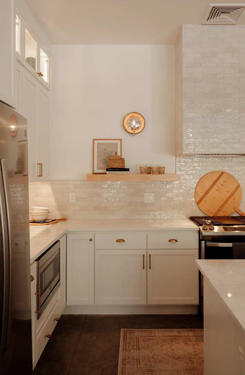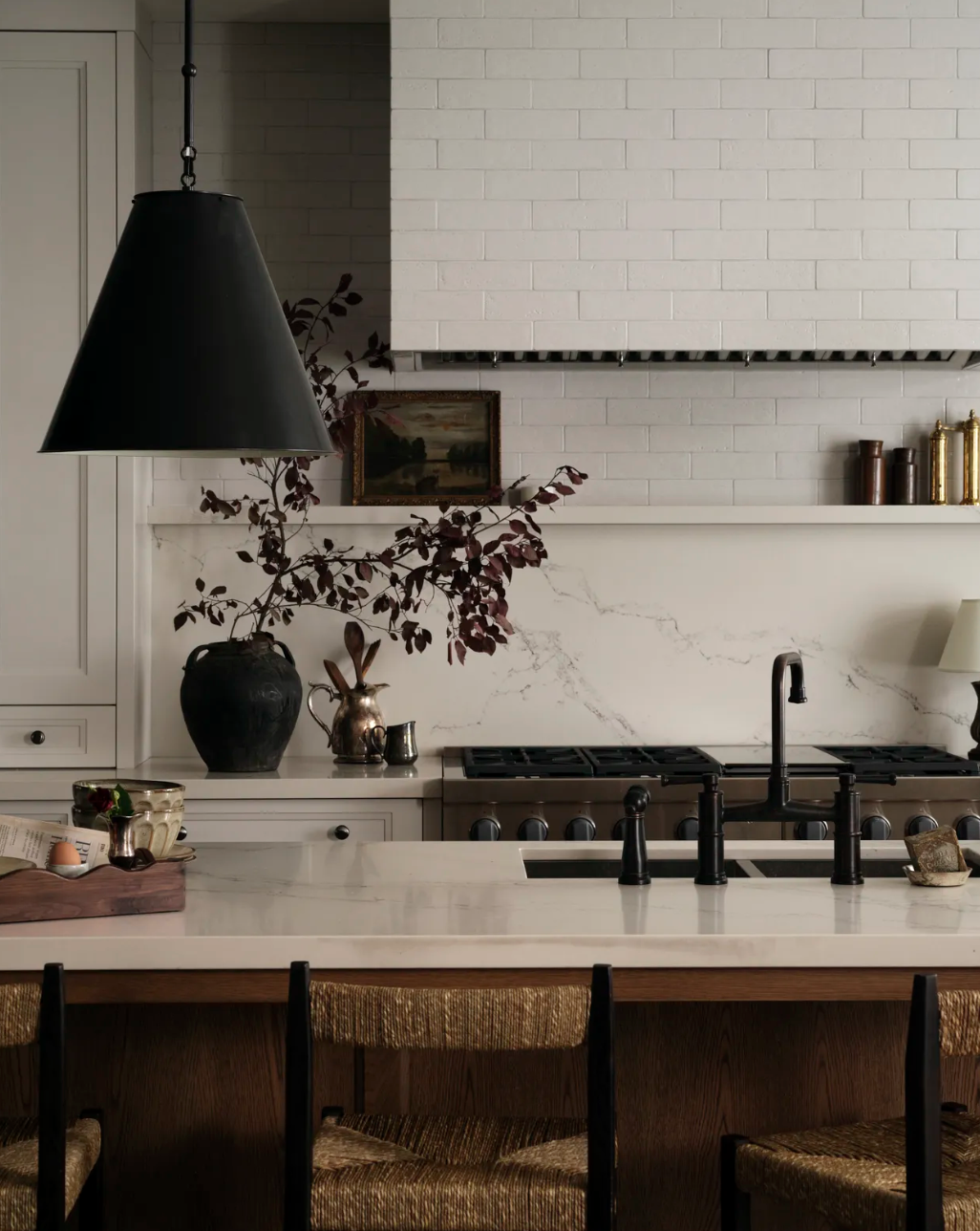 Kitchens with zellige tiles are having a moment. The way light bounces off the uneven surface of a zellige tile creates a shimmer in any space, and brings a room to life with light. “I love the imperfection of a zellige tile. The imperfections of the tile add character to the space and add an organic feel in a space that can otherwise feel a bit hard,” says designer Tiffany Leigh. In this kitchen by Brooke Mennen-Talsma of Brooke MT Interiors , using zellige tiling on a range hood helps foster that calming feel and the designer opted to connect the backsplash to the hood, creating a cohesive feel. “Zellige style tiling gives a very lived-in, authentic feel to new-construction homes,” says Brooke. “It creates a warmer aesthetic rather than everything appearing brand new and perfect and adds a lot of texture and dimension to a kitchen that would otherwise be too bright and white.”