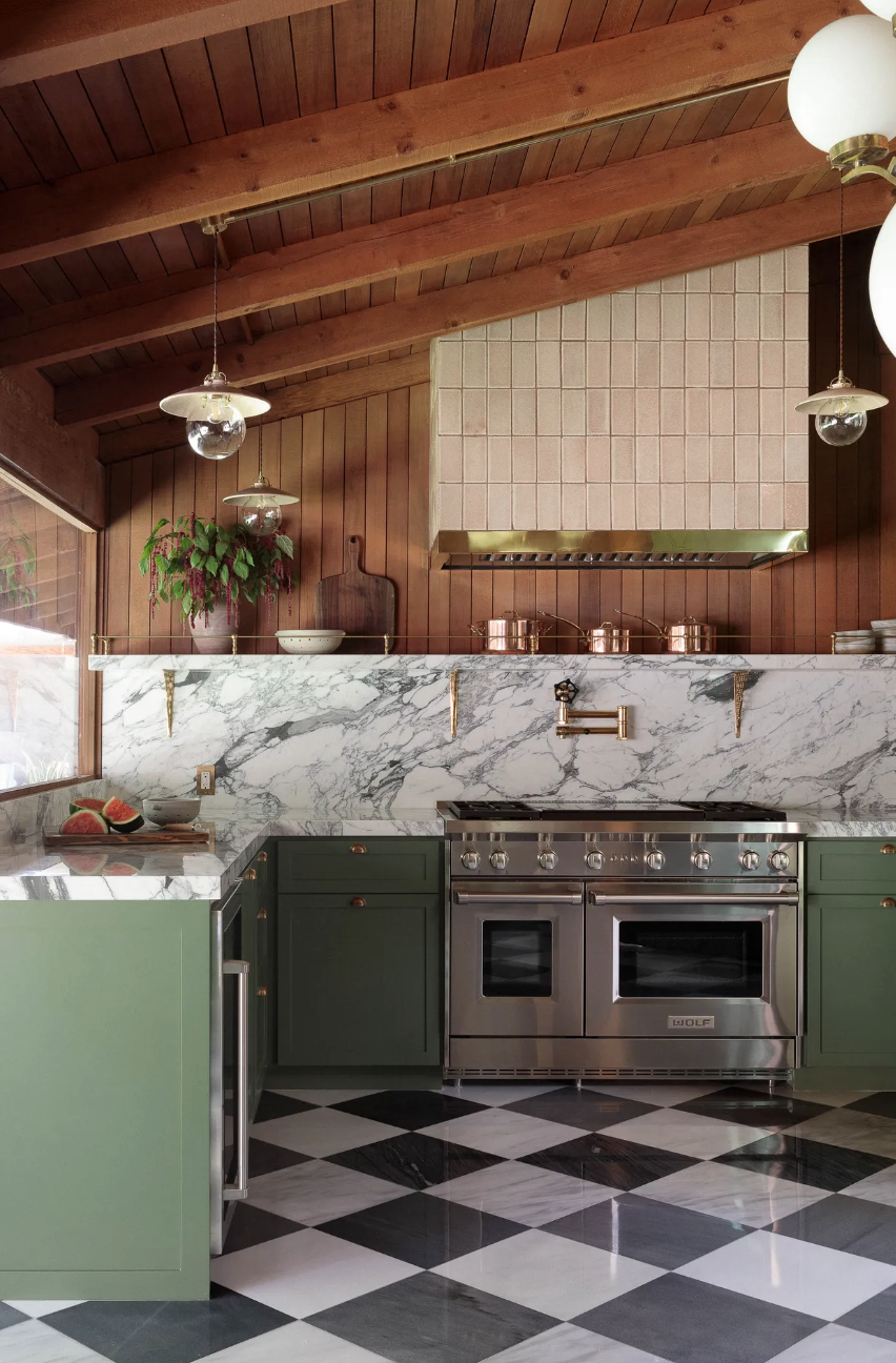 The obvious temptation is to blend your range hood with the kitchen backsplash to create a seamless feel, but this design by Jacqui Seerman proves that standing out is sometimes the best solution. “To honor the client’s desire to preserve the original wood paneling while incorporating new finishes and colors, we selected warm terra cotta ceramic tiles from Waterworks, chosen for their similar width to the wood planks,” explains Jacqui. “Installed vertically, these tiles complement the paneling while introducing a rich contrast in texture and color.” For Jacqui, making a design focal point with the hood is a growing kitchen trend. “The market has long been dominated by large, monolithic hoods in materials like slab, stainless steel, brass, and plaster,” she explains. “While timelessly beautiful, the shift toward tile reflects a broader trend toward artisanal, hand-hewn, and textured materials. From kitchen countertops to walls and hoods, tile introduces a refreshing sense of material diversity and craftsmanship.”
