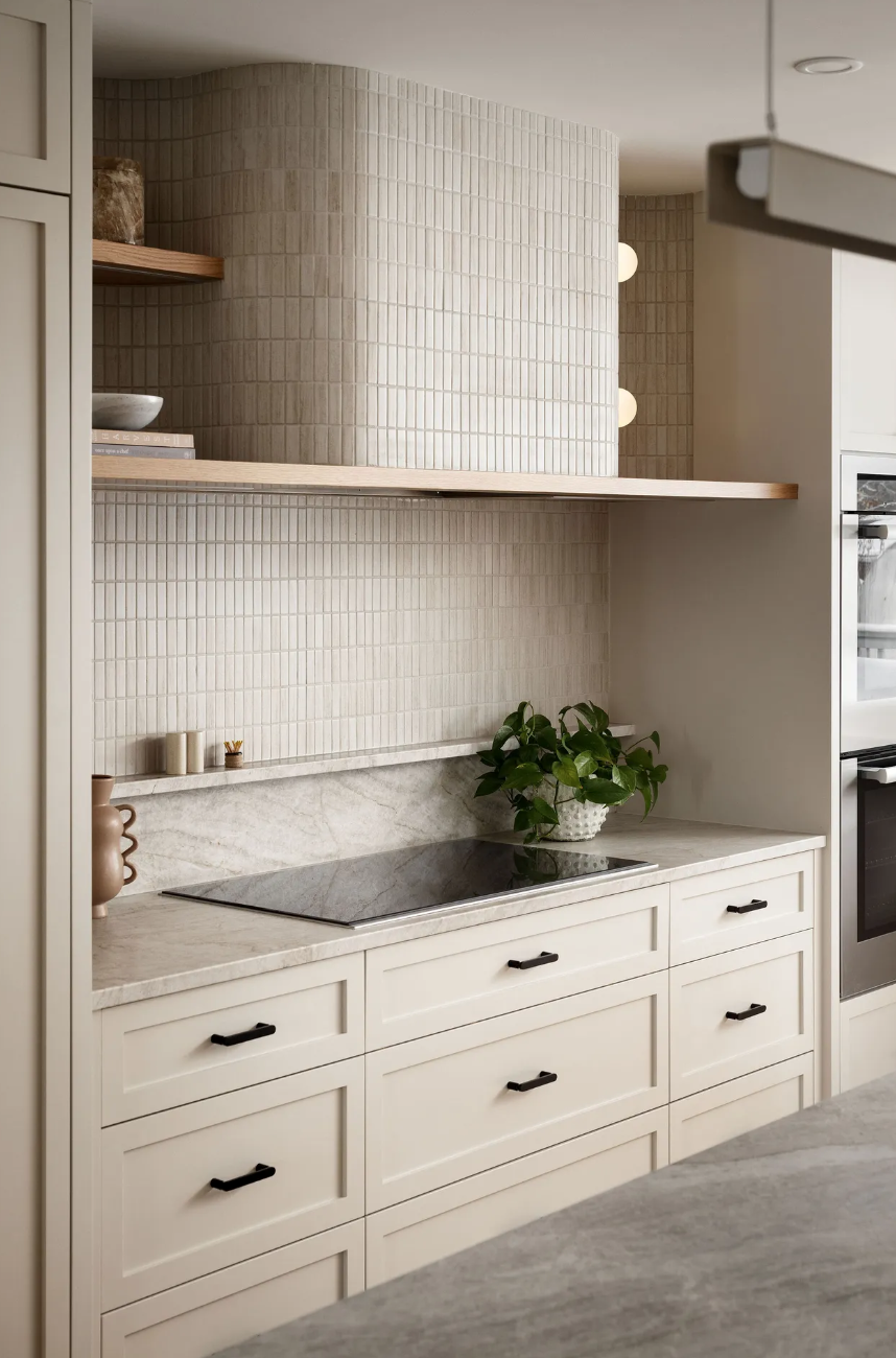 Think about the shape of your tiles. These stacked tiles bring more texture and make a feature out of the grout lines. Designer Meghan Bannon of Mera Studio has used stacked tiles and a curved hood for something that plays with lines, shapes and shadow for a wonderful effect. “Sometimes a monochromatic color scheme is all you need. When designing this home we knew we wanted to create a welcoming softness that pulled you into the newly opened space,” says Meghan, founder at Mera Studio. “Tone on tone creams and subtle textures create a kitchen moment that is both easy and approachable.”