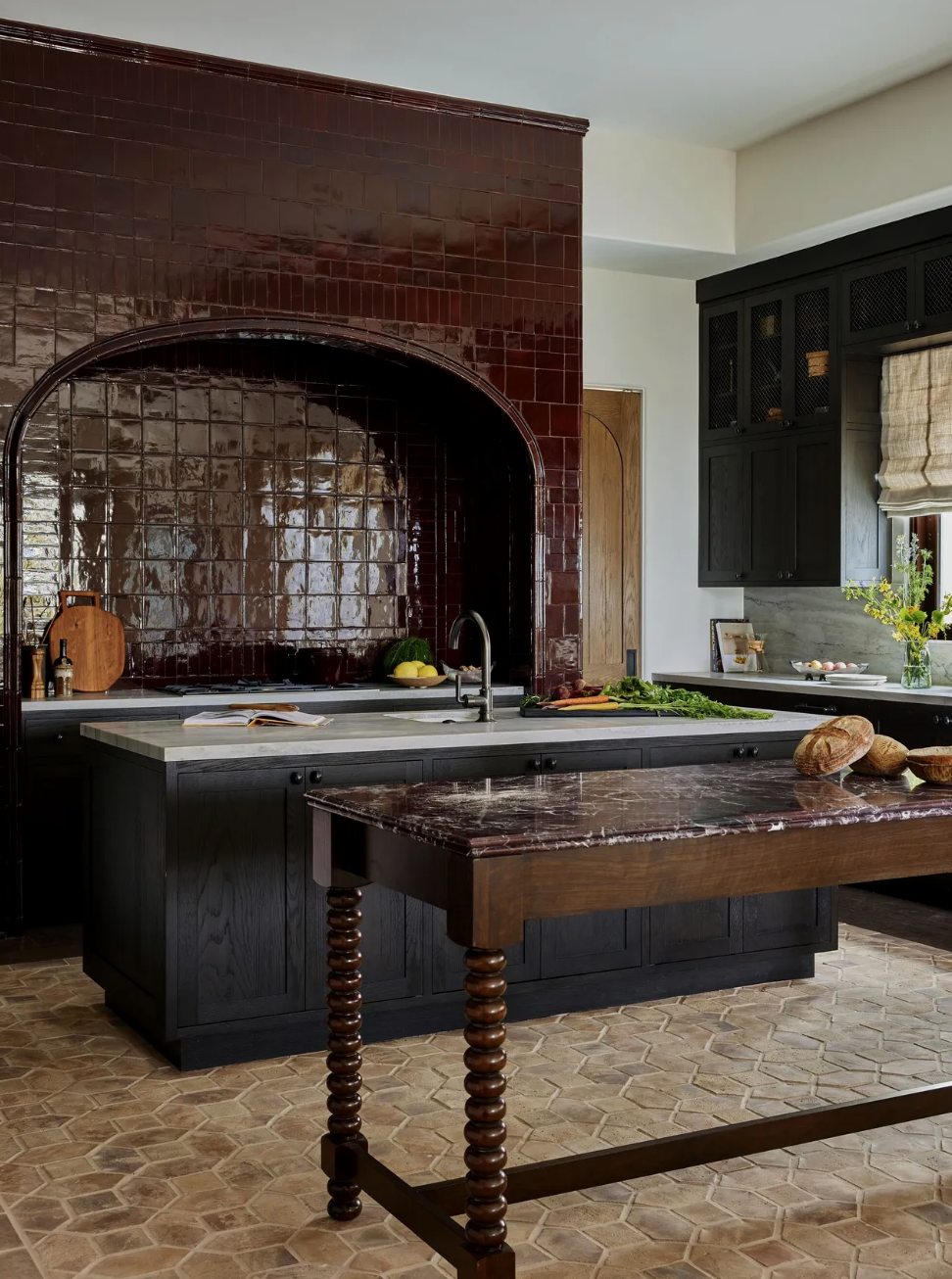 We’ve been seeing gloss and lacquer used in the kitchen too, with the trend for high gloss kitchen cabinets making a comeback. In this kitchen in Pacific Palisades, designed by Electric Bowery, deep Cordovan glossy tiles are used. “The glossy range hood is really taking off,” Electric Bowery’s interior design director Stephanie Luk. What’s more, going for a deep color like dark red, green, and even a deep, dark neutral gives a kitchen a little extra edge. “The handcrafted feel, with slight variations in color and tone, adds character to a space. It creates a surface that feels very dynamic at every angle,” adds Cayley Lumbar, principal of the studio. “The glossy finish reflects light at different times of the day, which not only brightens things up, in the day, but also add dimension at night. The texture of the tiles also adds depth, added visual interest, and makes a functional range hood feel considered in the overall design of any kitchen.” Opt for polished tiles to go for the glossy effect, or coat your tiles with a tile sealer to add lasting shine.