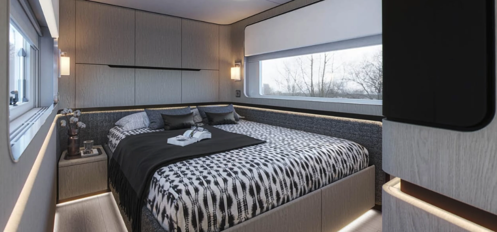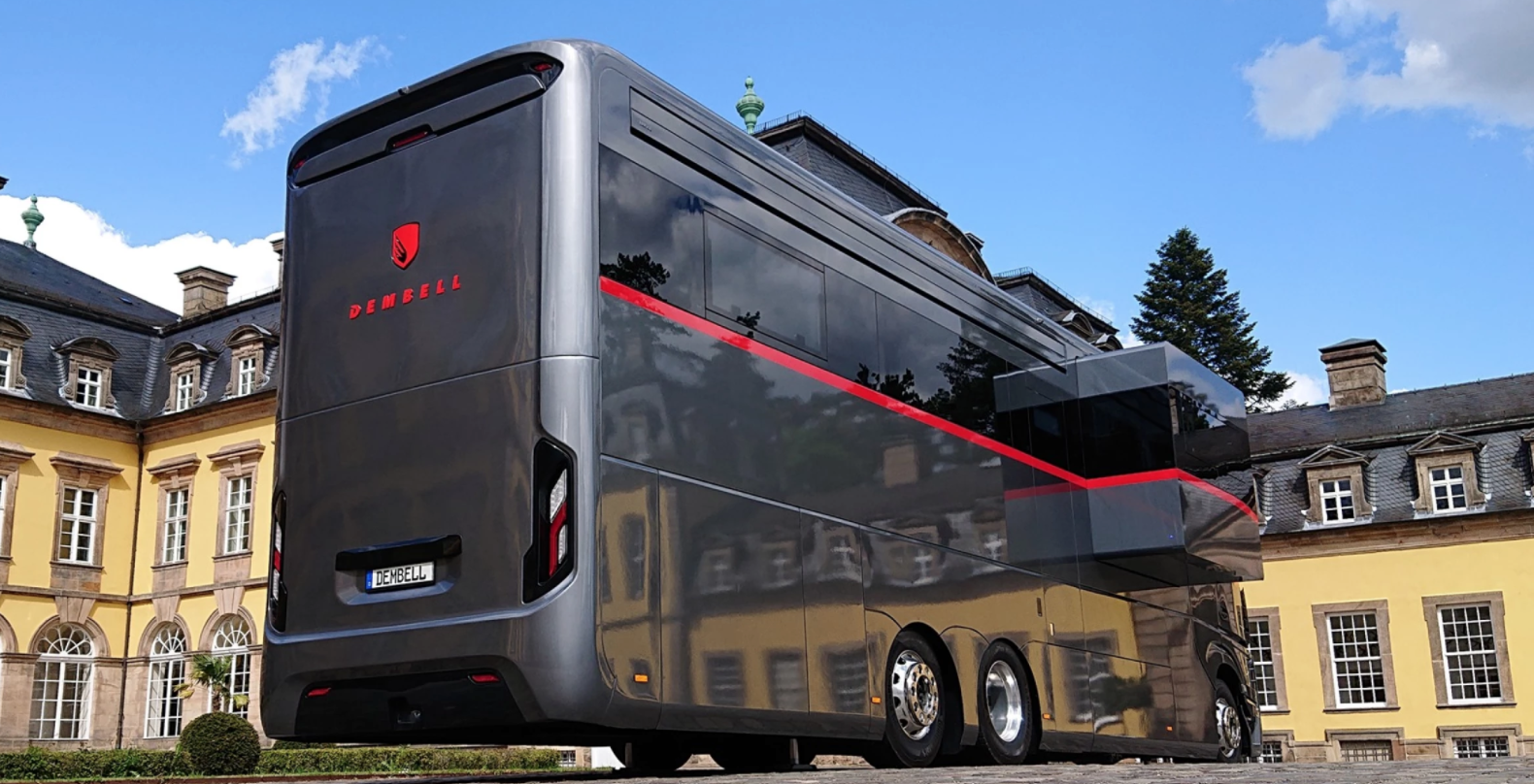 Poised to draw envy from owners of “yesterday’s” supercar-carrier land yachts, new European marque Dembell aspires to create the most luxurious land yacht the world has seen. With its stretched, three-axle Mercedes base, triple-expanding, yacht-appointed interior, motorsport-inspired exterior and impressive self-sufficiency suite, Dembell may even lay claim to the world’s first “land superyacht” lineup. Not satisfied to merely use the “land yacht” moniker as a marketing term, Dembell’s management team pursues a purer definition, leaving its interior appointments in the hands of an Italian design firm with experience bringing to life the interior spaces of Azimut yachts. The initial results appear impressive, even for the “money is no object” end of the motorhome market.