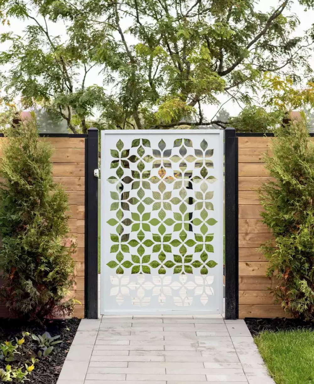 Want your fence to feel less like a blockade? Break up bold colors or stark materials with a fun pattern. It doesn’t have to vary wildly from the original material, but just enough to lighten things up. Minimal circles, wavy grates, or chevrons may be all that’s needed to elevate it.