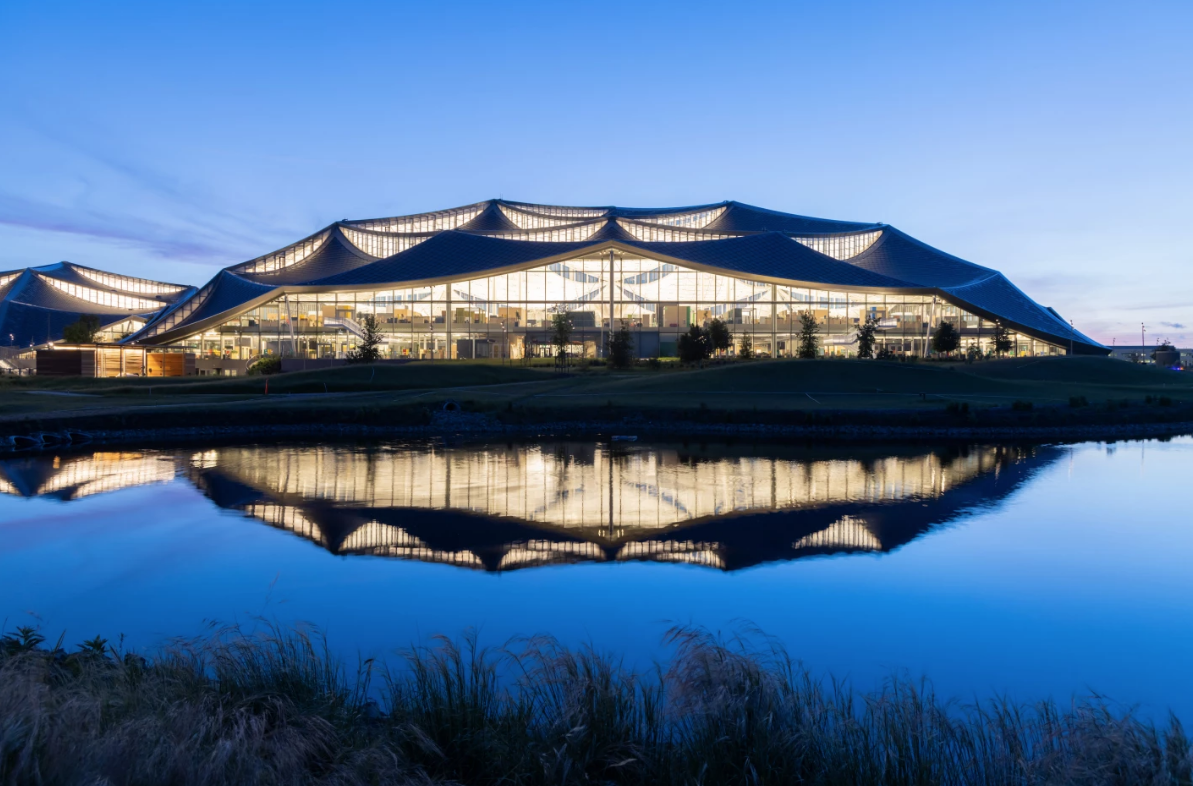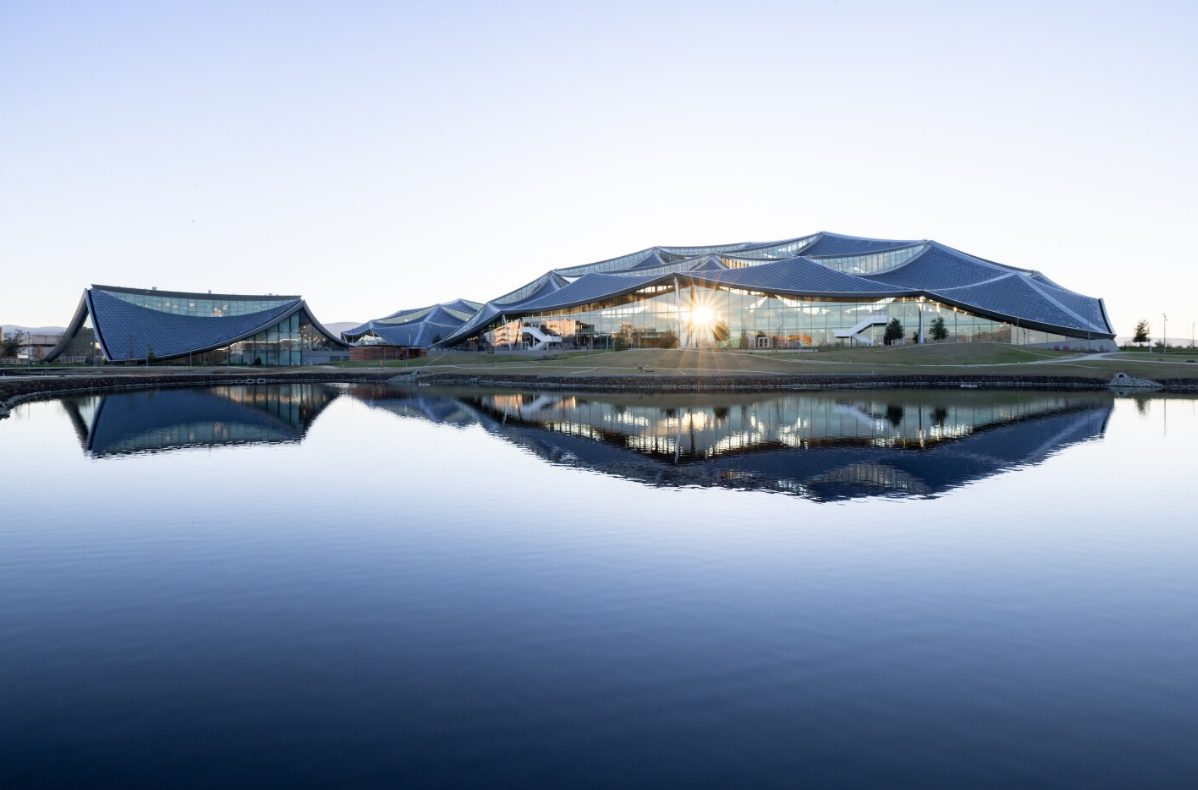 The project has undergone some changes over the years and now that it’s complete, looks a lot less tent-like than it did in the early renders, thanks largely to its so-called dragon scale roof, which was created by Swiss firm SunStyle and features a textured prismatic glass shingle with a unique coating that makes it sparkle slightly. It comprises 90,000 building-integrated solar panels that produce roughly 40 percent of the building’s annual electricity needs – and since the campus is wholly powered by electricity, that’s significant. Nearby wind farms also add the energy mix.