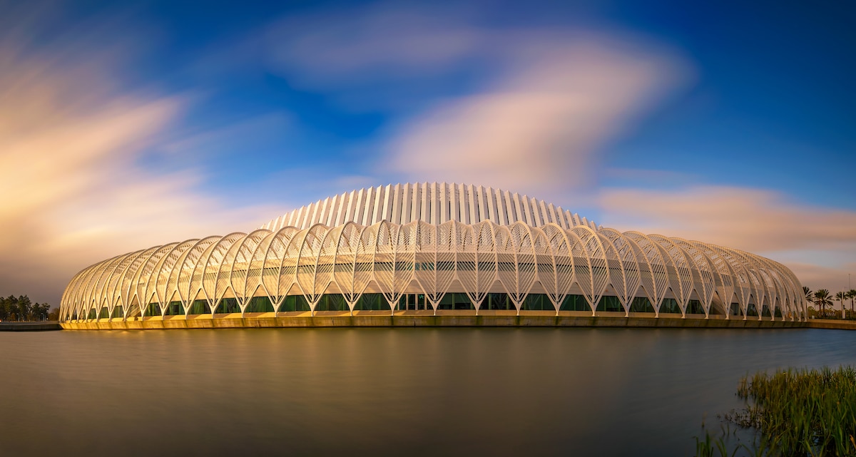 Turning Torso is a residential building in Malmö, Sweden, based on Calatrava’s previous sculpture of the same name. The original Turning Torso was based on the form of a human contorting their body. The building also has an interesting narrative behind the commission. Johnny Örbäck, the former managing director of a co-op association called HSB Malmö, saw the original sculpture after learning about Calatrava’s architectural work. He then decided to commission the architect to build HSB Turning Torso. Each segment of the building is made up of five floors and twisted clockwise from the central core. Most of the building is made up of residential units available for lease, but Turning Torso also includes an observation deck, a private club, restaurant, and room for public events.