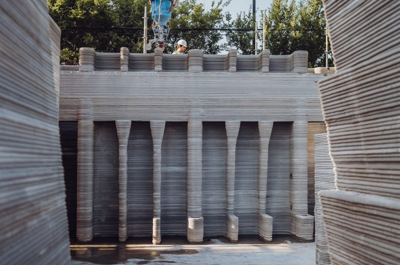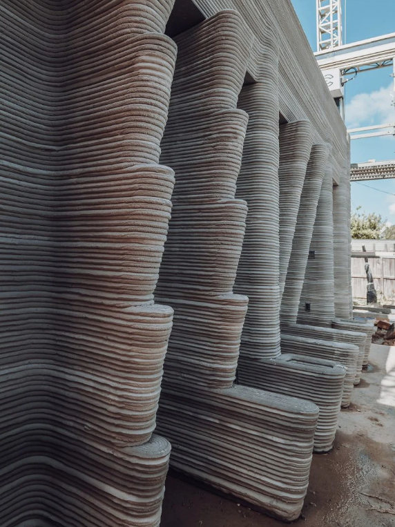The hybrid structure is being constructed from 3D-printed concrete combined with wood framing and was designed as a multi-storey single-family home.