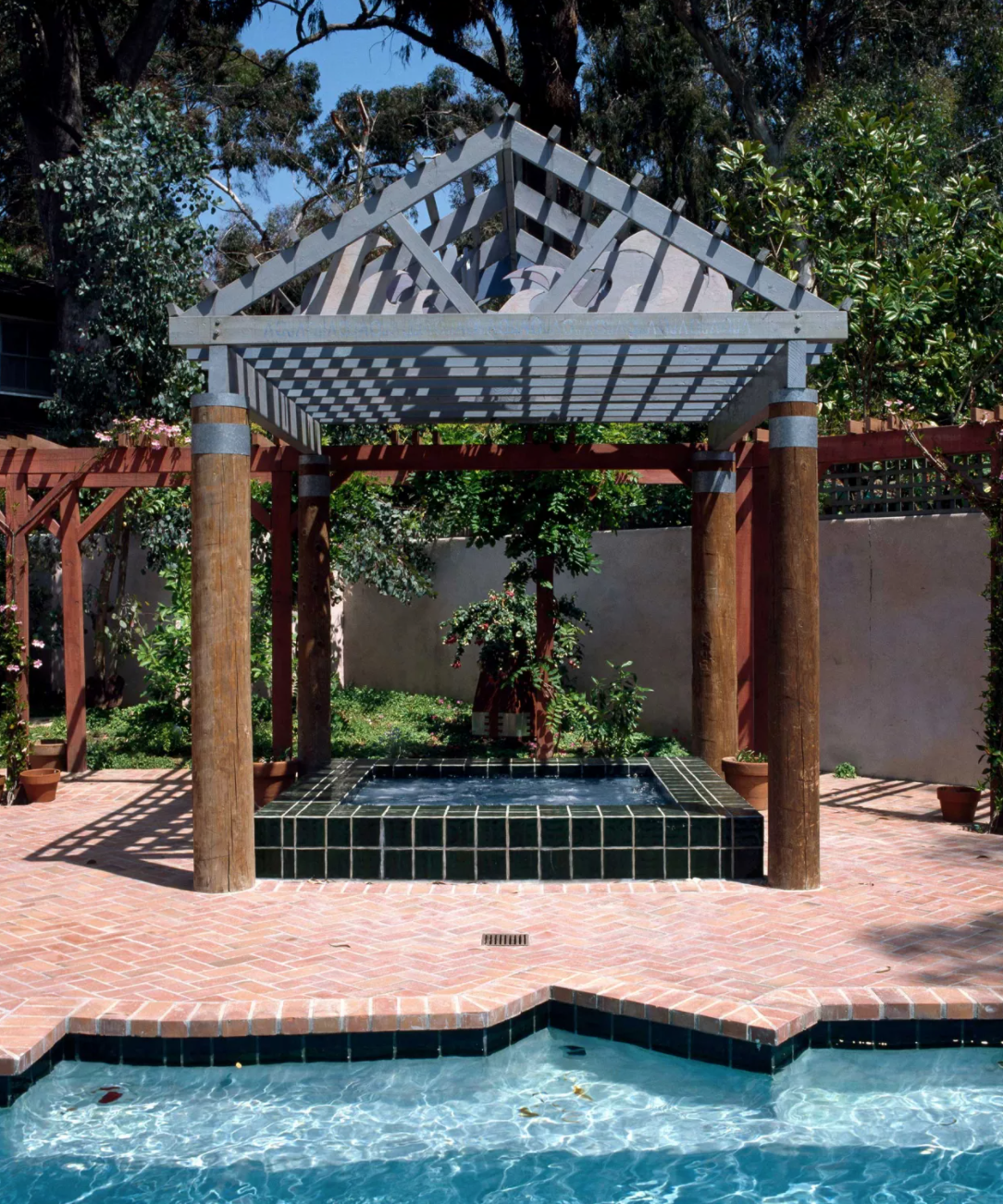 Hot tubs are a lovely accompaniment to pool ideas. Integrated designs are popular, with ‘spillover’ features bringing a sensory sound to the setup. However, if yours is separated from your pool, a gazebo can be a great way to define your tub into its own distinguished chill-out zone. This pretty design slots into its surroundings well, and we particularly like the ornate details just below the roof for that extra dose of style.