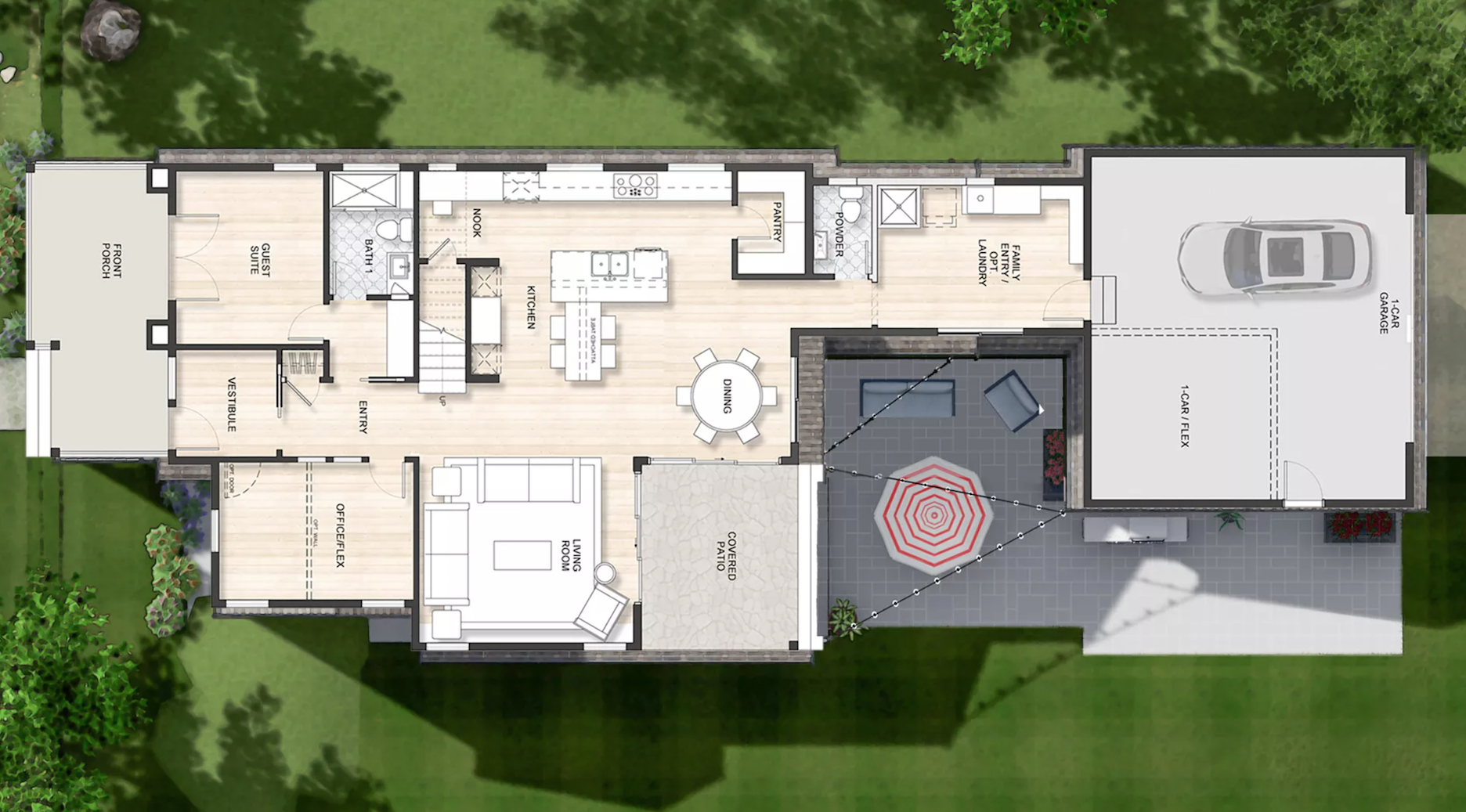 - It includes “separate homeowner and guest entries, two dedicated office spaces, flex spaces, a guest suite with outdoor access, a larger family bathroom, multiple covered outdoor spaces, improved kitchen functionality, flexible storage, drop zones for package deliveries, and more.”