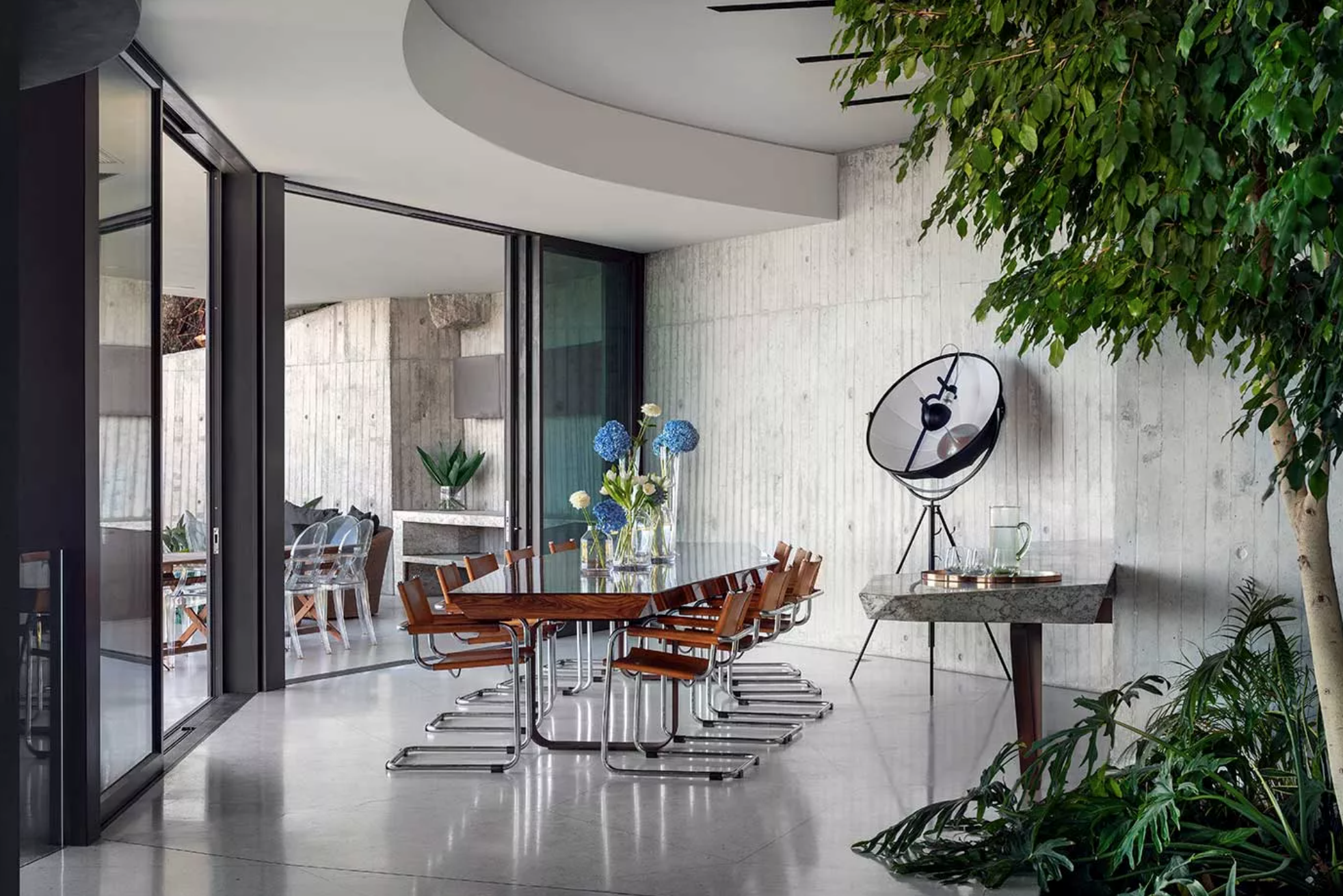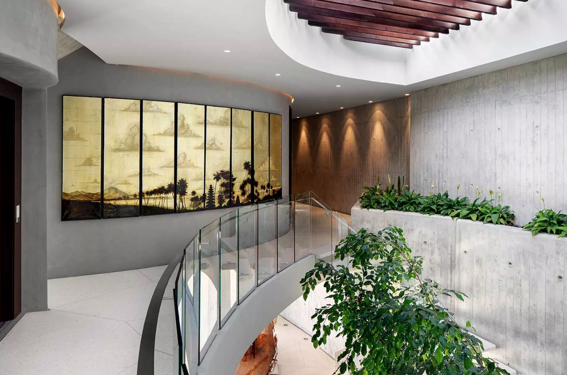 An architectural masterpiece designed by Peerutin and inspired by the works of former American architect John Launtner, the home conveys Launtner’s influence of iconic modern homes built in the 1960’s in and around California. Launtner designed expansive, lateral concrete properties, many of which were perched on clifftops with breathtaking views. These homes frequently served as the backdrop for films, including Bond films and Iron Man’s home. Due to the size of the existing rock formations and to maximize the 270 degree views, this Peerutin project needed to be divided into two wings.