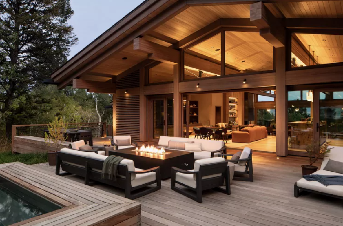 This modern chalet-style home from WRJ Design features a sophisticated outdoor living room on the back patio that is anchored by a massive sleek rectangular black fire pit that adds contrast with the wood decking and is complemented by high-end upholstered outdoor seating.