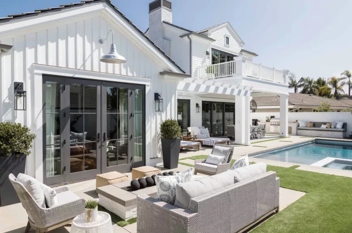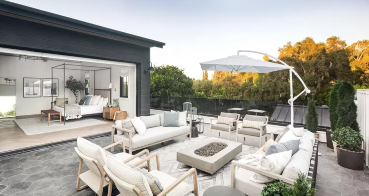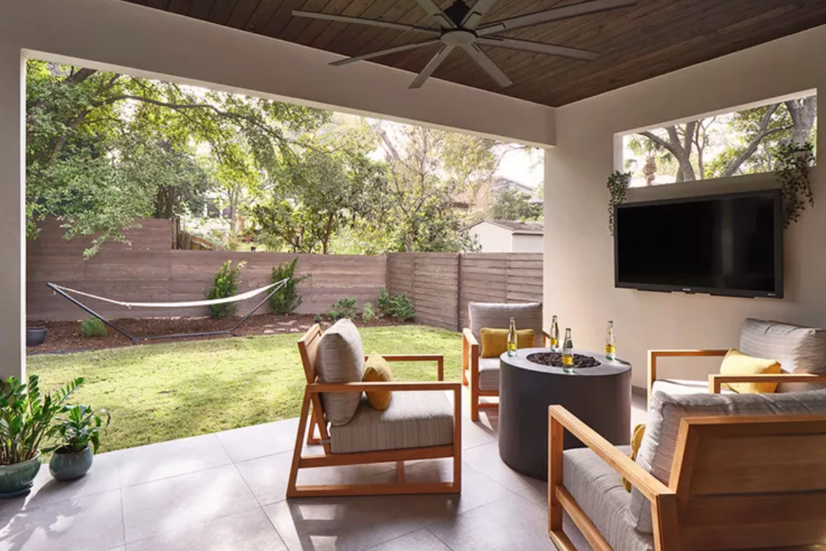 This Austin, TX bungalow from Martha O’Hara Interiors includes a backyard patio with a flat screen TV and comfortable outdoor armchairs around a small fire pit.