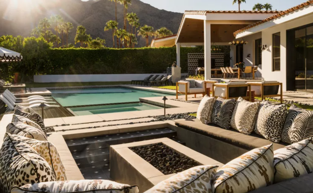 Michelle Boudreau Design added a sunken U-shaped conversation pit that is anchored by a large rectangular fire pit to create a destination in this Palm Springs backyard.