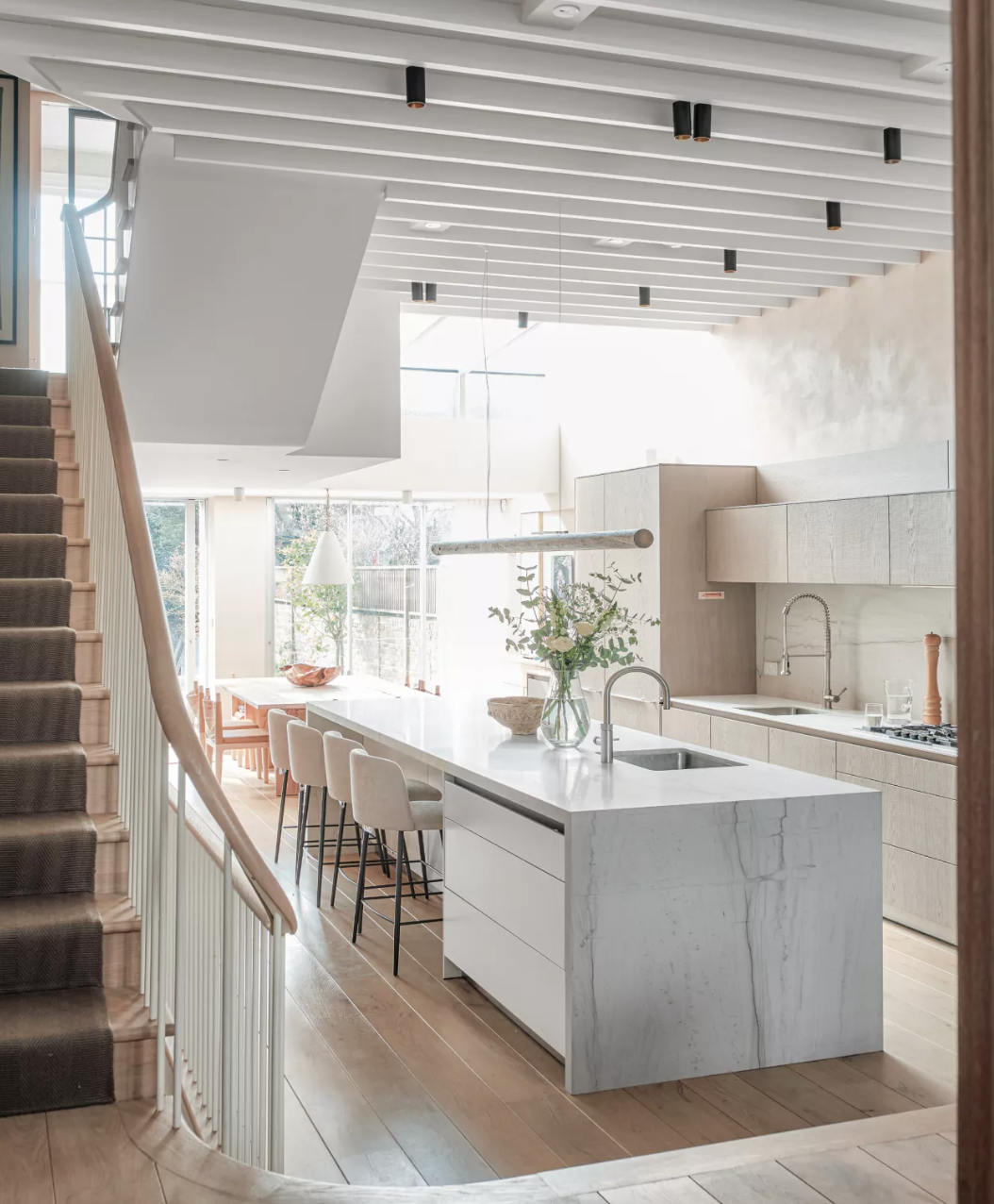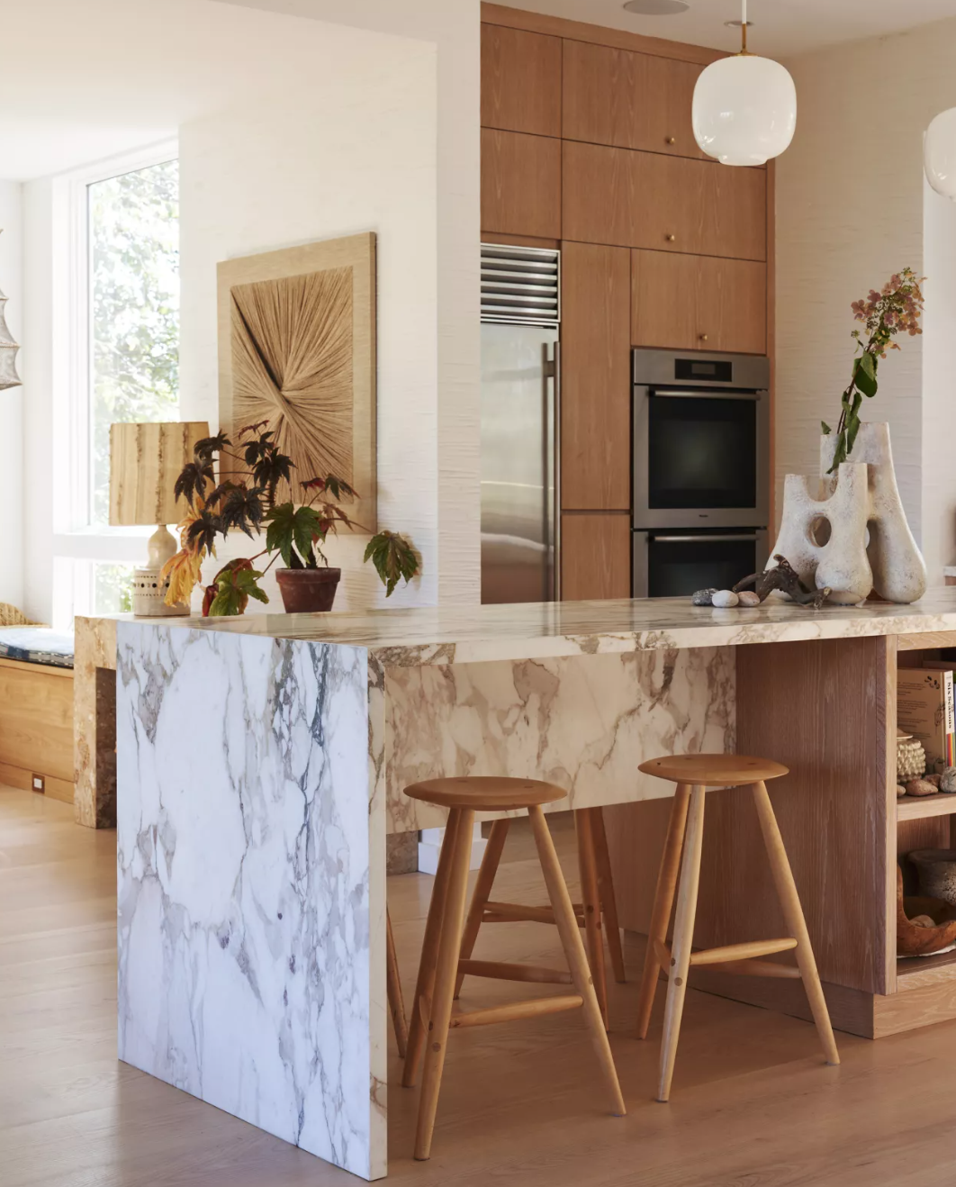 The beautiful warm-toned, dramatically veined marble is really commanding the attention here. Balanced with the simple cabinetry and color scheme the space remains minimalistic but with touches of the traditional – the herringbone flooring, the pendant lighting, the slightly farmhouse-esque stools. The whole vibe is giving minimalism with a traditional twist, and it’s that twist that makes this kitchen feel less clinical and more cozy. ‘This kitchen is housed in a large turn-of-the-century Victorian house. The proportions of these homes are always so fun to deal with but present challenges that need to be thoughtfully considered. In this project, we wanted to ensure the scale was balanced and the space felt intimate, and not overwhelming,’ explains founder of Nune, Sheeena Murphy. ‘The kitchen sits in the center of the main floor and we created a more human scale by limiting the height of kitchen cabinets and allowing the upper part of the walls to breathe. The introduction of architectural curves evokes a sense of invitation and the very visual stone on the worktops and backsplash draws you in. The blend of more traditional oak herringbone flooring, handmade counter stools by Edward Collinson, and classic Devol lighting are balanced with simple, modern cabinet design and a dynamic marble, and the idea was that this mix of elements would evoke a feeling of being in a modern farmhouse kitchen, but in the middle of a bustling city outside.’