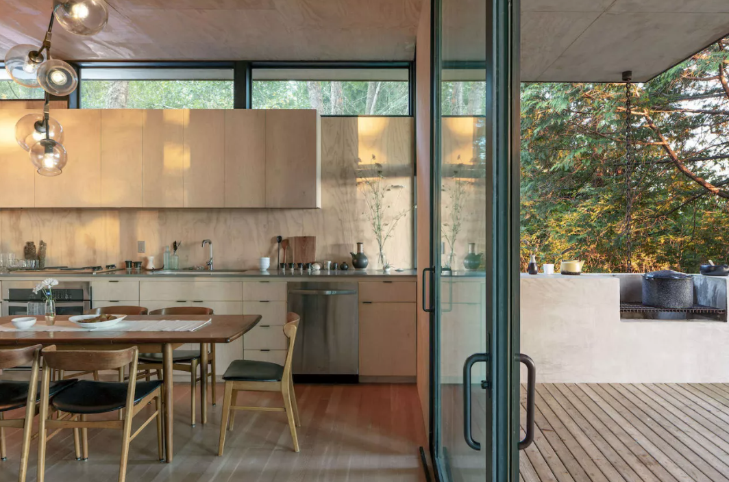 Wooden kitchen cabinetry is a classic choice, and it leans into both the sleek and rustic sides of this style. In this kitchen designed by Wittmann Estes, it’s used in its most pared-back, natural, and unfinished form and the results are a kitchen that feels both very modern and minimal but filled with character. And note how the same wood is taken over the backsplash to create a beautiful, almost uninterrupted span of wood allowing the pattern of the grain to become a real feature. ‘We sought to dissolve the barriers between the inside and out, between forest, garden, and structure,’ explains Matt Wittman Principal of Wittman Estes. ‘Interior surfaces are rendered in wood materials – local fir for the floors, pine on the walls and ceiling, and cedar on the outdoor decks. A 10’ tall multi-slide fir door opens onto the west deck, where the kitchen counter extends to become a wood-fired barbeque.’ ‘We use a lot of natural materials like wood, steel, and concrete that express themselves through their inherent qualities and textures. The grain and figuring of pine wood wall paneling offer a warmth and connection to the forest through a memory of its source as a tree. Fir flooring has a softer and warmer feeling on the feet, and the warm yellow and orange tones of the fir offer a visual warmth. Our interior design focuses on the sensory qualities of materials, the tactile feeling on your feet and hands, and the visual softness of nature’s textures, tones, and hues.’