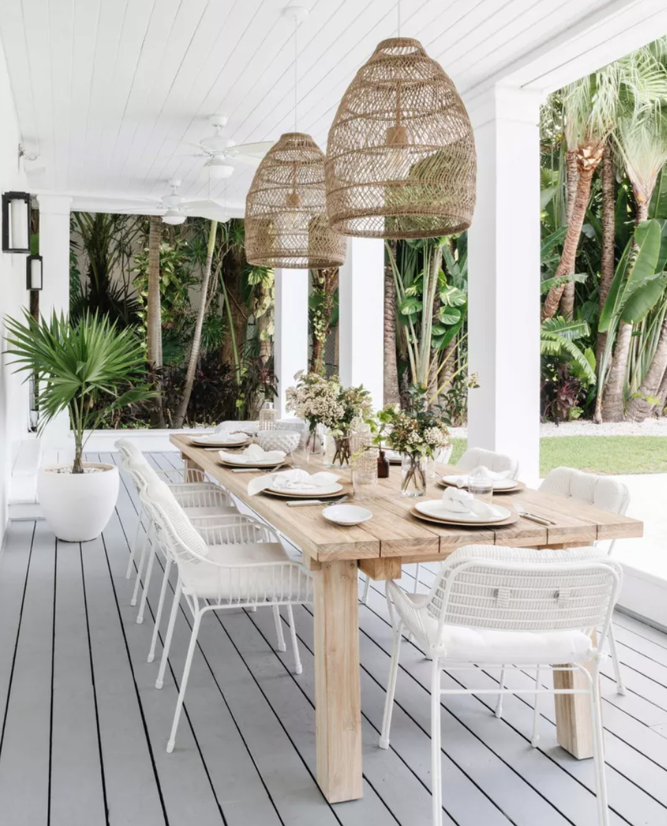 Expand your lighting search beyond classic string lights, and keep an eye out for sleek pendant lights, statement-making chandeliers, and other outdoor-friendly options.