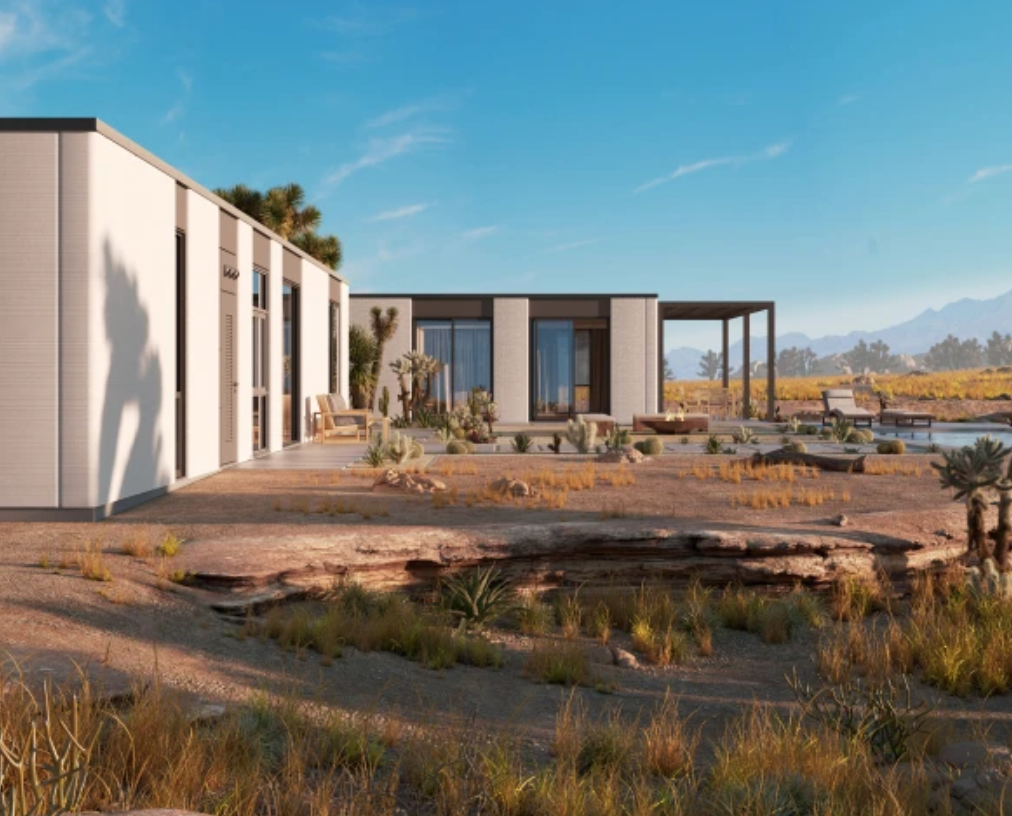 Perched in the rocky, rolling, cactus-filled foothills of Desert Hot Springs, California, midway between Palm Springs and Joshua Tree, is the sleek prototype of a 3D printed home known as the “Mighty Quatro.” Designed by Culver City architects EYRC and built by automated home manufacturer Mighty Buildings, the flat, rectangular abode, faced with textured 3D printed panels and tall, rectangular windows, is the first of almost two dozen that will soon help fill a gated community here. Oakland-based Mighty Buildings asserts that its homes are twice as fast to build, 99 percent less waste-generating, far more precisely-crafted, and (thanks to its stone-like composite) four times stronger than conventional residences. When it launched in 2017, it planned to create one-off lodgings for discerning homeowners. But their model has since shifted dramatically in favor of projects like this one, in which they partner with homebuilders to create larger developments.