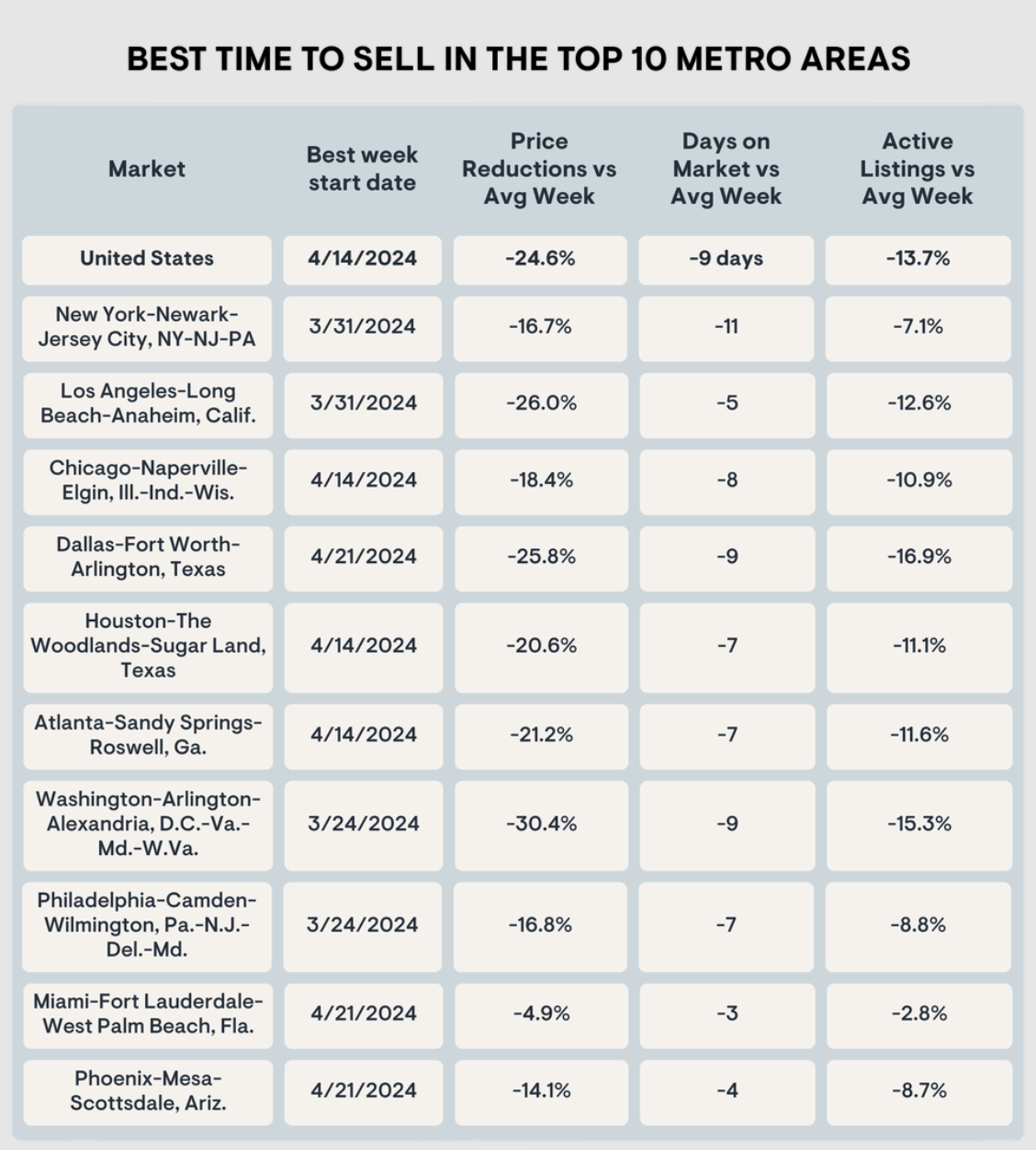 This year, the best week for a quick and profitable sale was in mid-April (the week of April 14, 2024 to be exact). “The third week of April brings the best combination of housing market factors for sellers,” Hannah Jones, Realtor.com senior economic research analyst, says. “The best week offers higher buyer demand, lower competition, and fewer price reductions than the typical week of the year.” That’s earlier than in years past: In 2023, the best weeks to sell a house were the first two weeks of June.