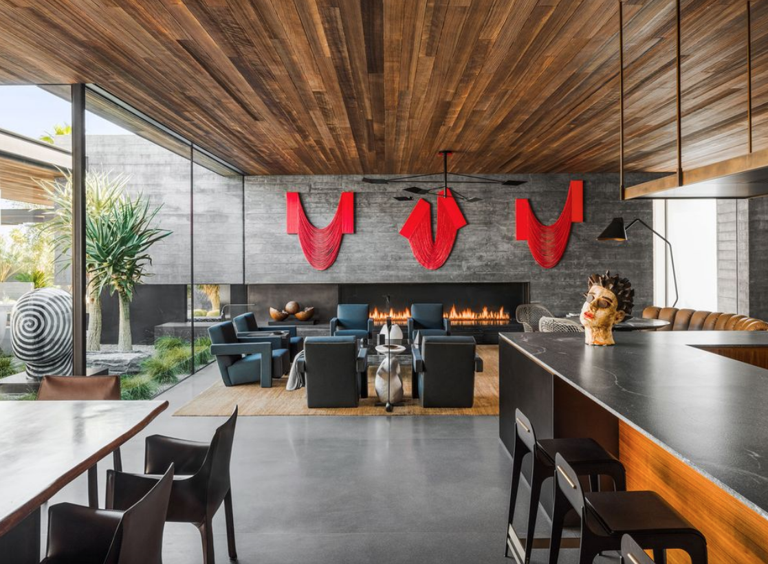 A cozy 7,200-square-foot house may sound like an oxymoron, but Palm Springs architecture has long been a standard-bearer for relaxed entertaining. Starting in the 1930s, architects such as Richard Neutra, Donald Wexler, and Albert Frey came to the desert and built soigné pavilions for chilling out in the rocky landscape. With its low-slung form, deep overhangs, and emphasis on outdoor space, this house is a clear descendant of desert modernism.