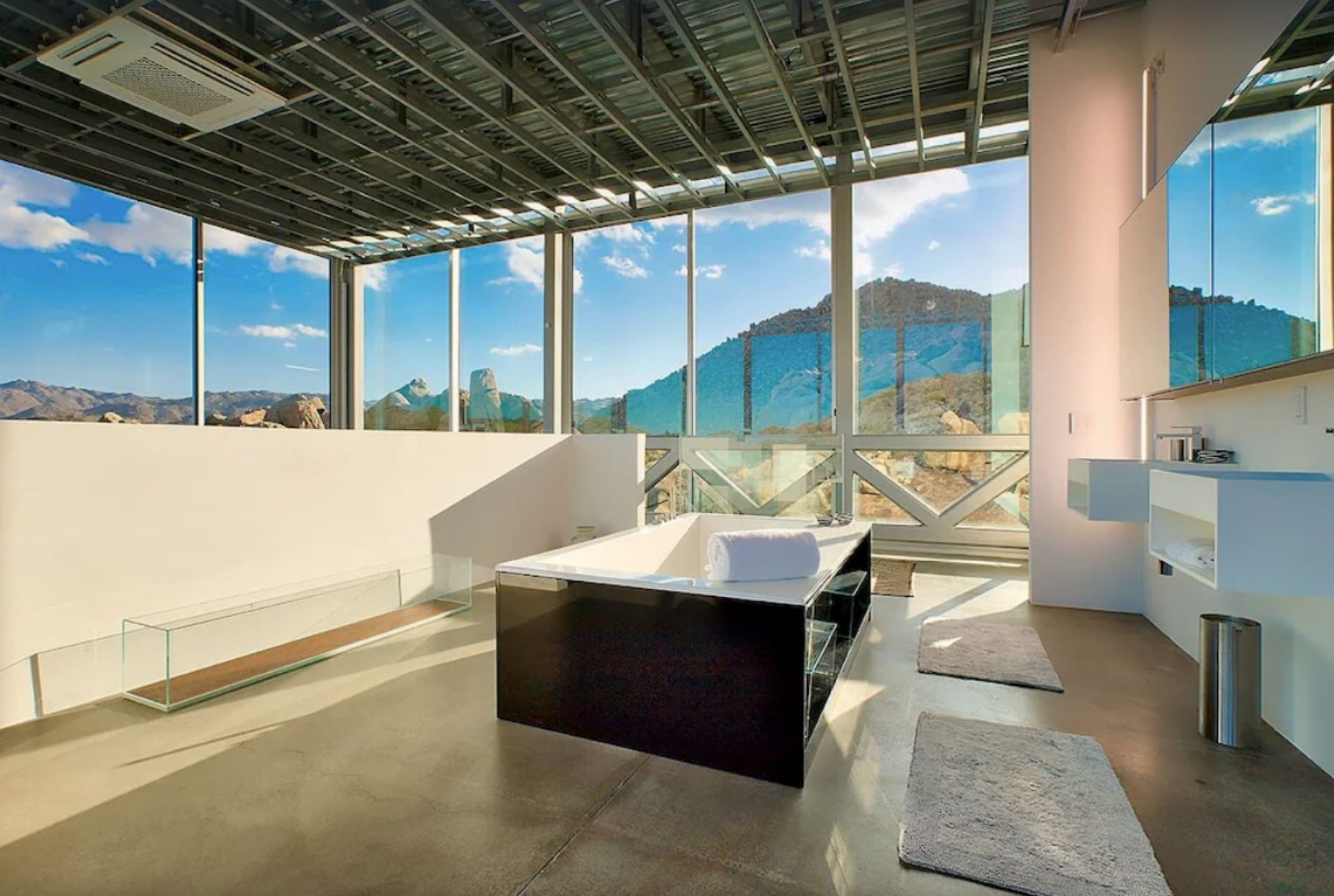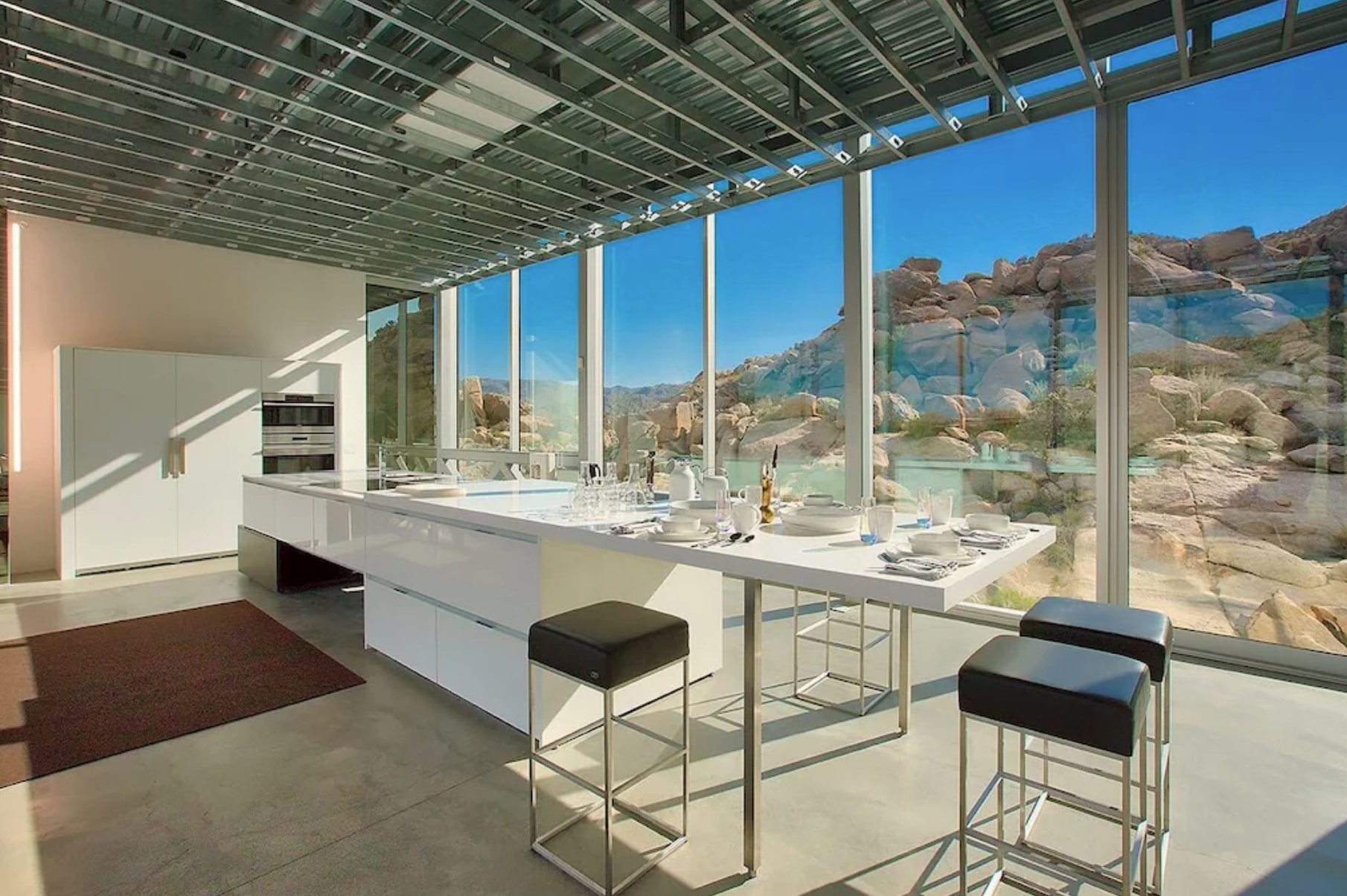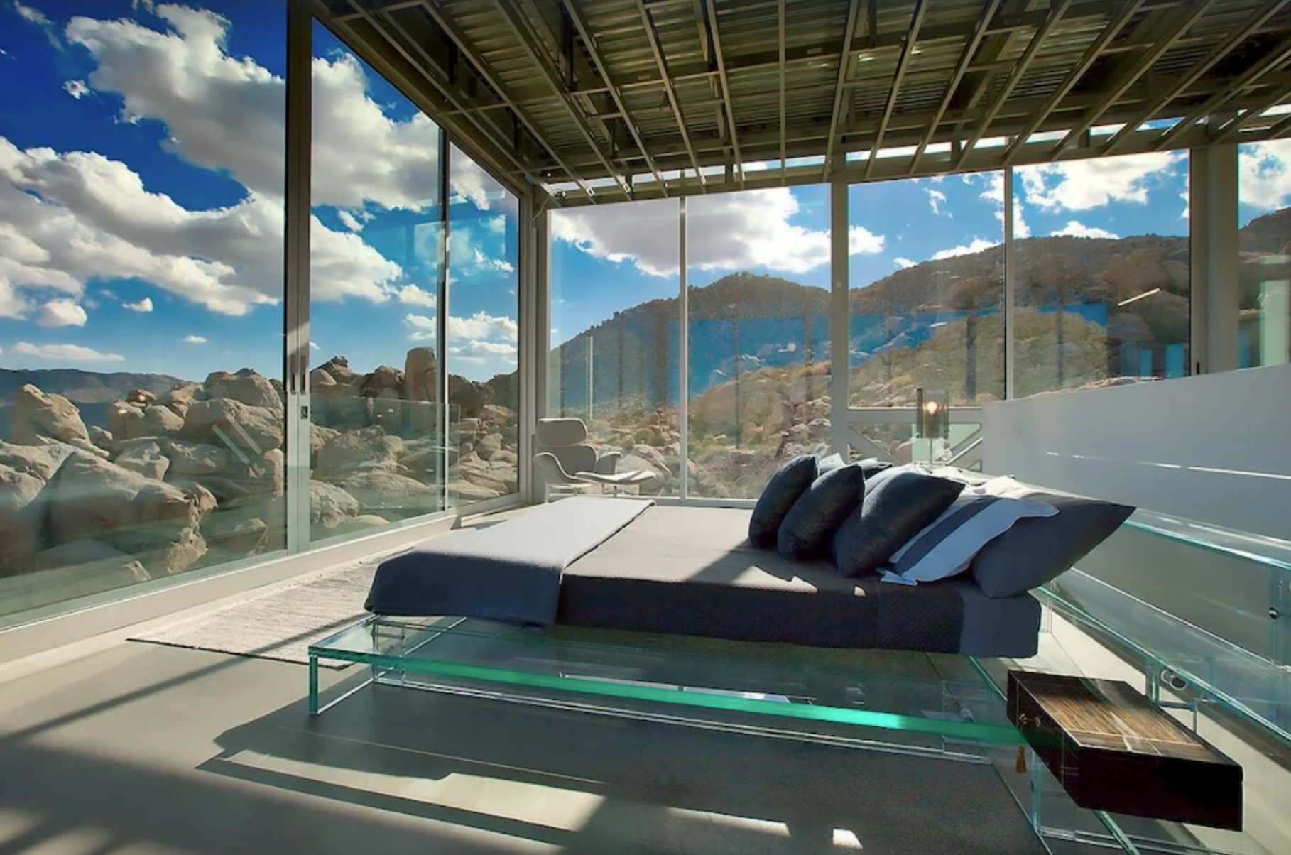 The sleek, 5,500 square-foot minimalist home features wall-to-wall views of boulders. Mirrored glass makes the building blend in with its surrounding desert landscape while offering stunning panoramic views from inside. Floor-to-ceiling doors slide open to let guests become one with the desert.