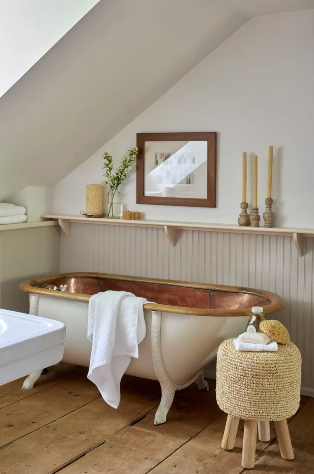 Given the amount of water present in a bathroom on a daily basis, the Water element is heavy in this space. The expert explains that it order to prevent the chi—and wealth along with it—from draining in this area, it’s very important to incorporate the earth element. “Yellows and earthy browns and tans, reddish hues, and pinks—these are all reminiscent of earth and help hold the chi in its space while grounding the energy here,” Magill Henry says. She advises that you stay away from dark colors and most blue hues, even though they’re typically regarded as popular bathroom paint colors. “These are common in bathrooms but are not the best shui, they add to the already present Water and can feel draining,” she explains.