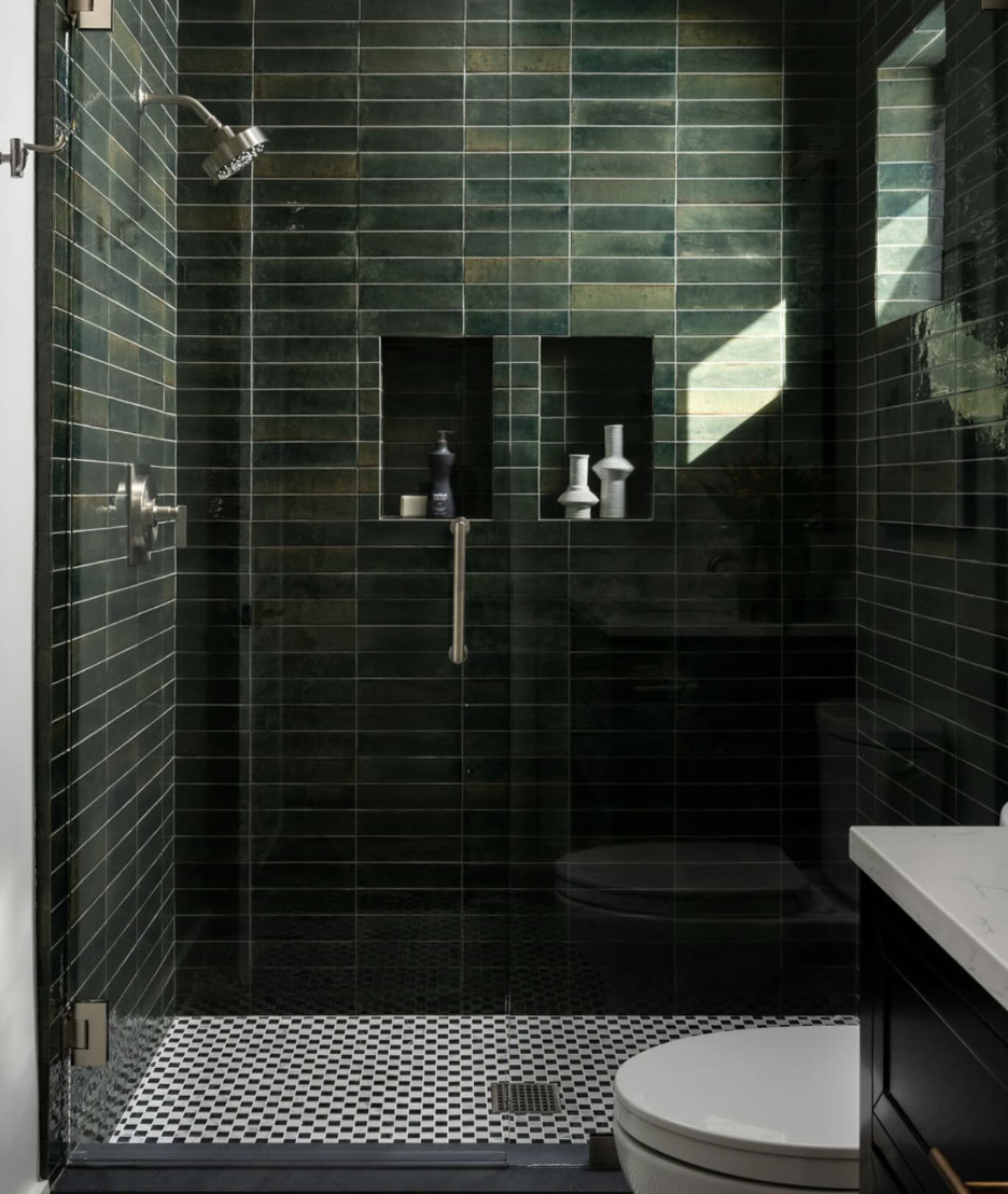 Dark colors are dominating in the design world, and shower tile is no exception. The dark, emerald green tile in this shower from @theflairhunter makes a big statement, and is an easy way to bring drama to a small space. The green pairs well with the small-scale black and white floor tile, which adds just the right amount of contrast. “Tile drenching is gorgeous, but for aging eyes or users with limited visibility, high contrast between floor and walls is safer and more practical,” says bathroom expert Amy Wasserman.