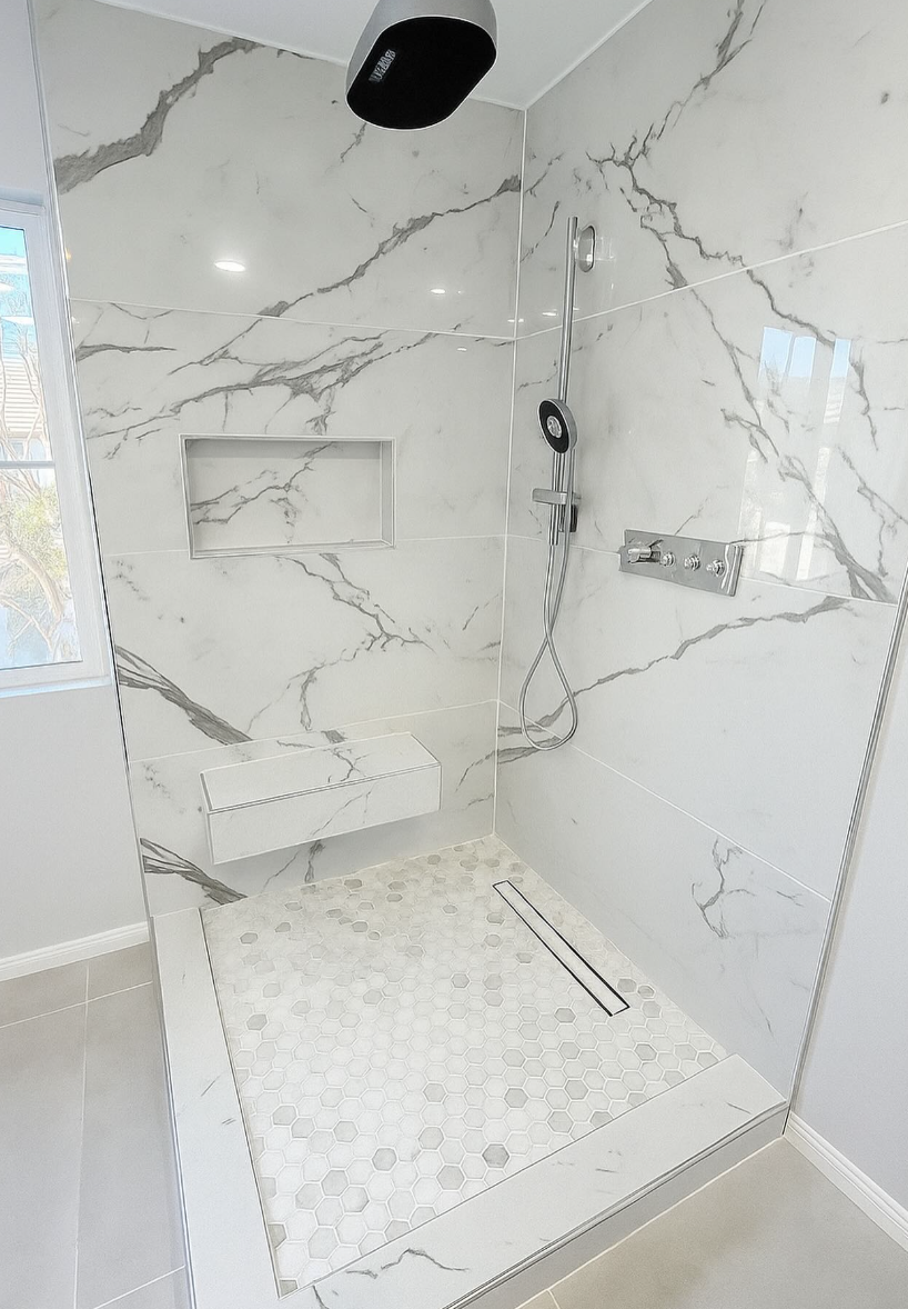Large-scale tile, like the one in this shower from @california_home_center, gives the illusion of one big marble slab, elevating the entire look of the bathroom for a fraction of the price. The gray veining adds subtle interest and elegance. “Large format tile can create a seamless, monolithic effect,” says Wasserman, “And fewer grout lines mean less visual interruption and easier maintenance.”