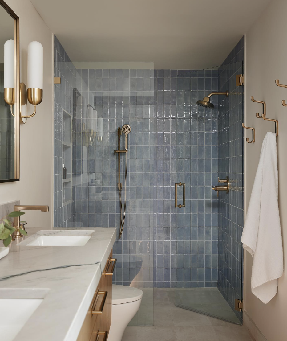 This beautiful shower from @kimberlyparkerdesign features glossy blue tile in a vertical stack pattern. The high gloss finish bounces light around the room, while the vertical layout leads the eye up to make the space feel taller. “Don’t underestimate the impact of tile layout and lighting. A simple tile can become striking when used in an unexpected pattern like vertical stacking,” says Wasserman.