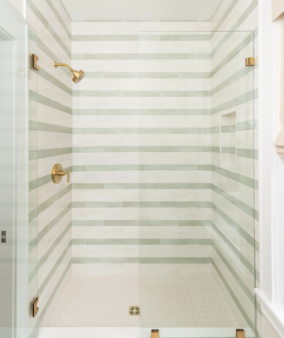 Take rectangular subway tiles to the next level by installing them in an unexpected pattern, like stripes! This green and white striped shower from @samanthajones_interiordesign would be simple to duplicate, and the color combination options are endless. Use frameless shower glass so the tile can take center stage. “Subway tiles also continue to be a favorite, particularly when done in a striking color or when installed in an interesting configuration,” says Bahbah.
